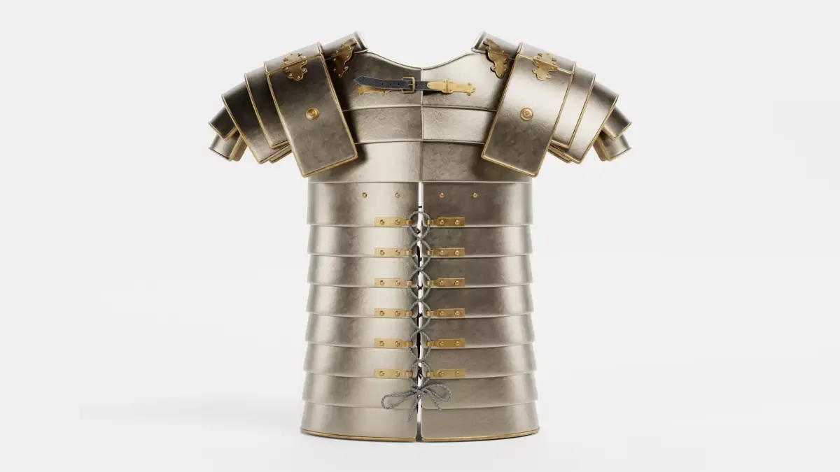 Aged Roman lorica segmentata with a natural patina and matte metal surfaces, reflecting battle wear. Lamellae, buckles, and shoulder details retain fine modeling, while darker tones and subtle surface imperfections convey authentic use. This version captures the character of a seasoned legionary’s armor with realistic materials and proportions.