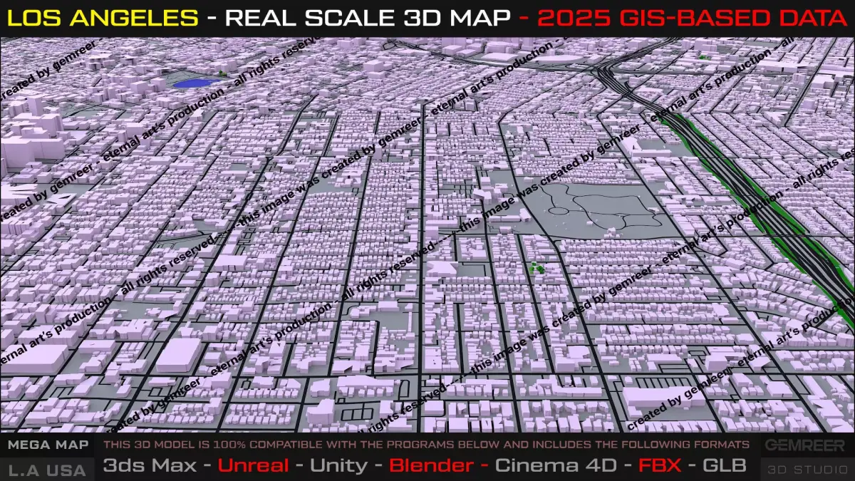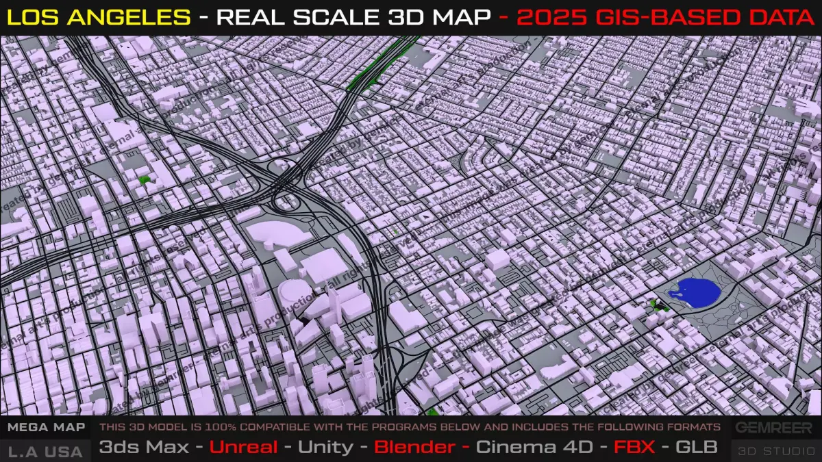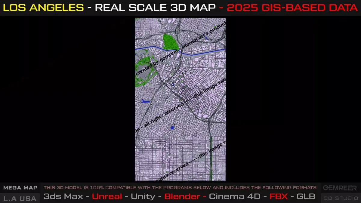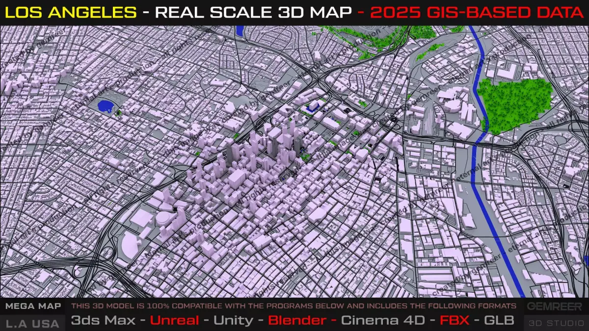 This product presents a real-scale, GIS-based 3D map of Los Angeles, covering the Downtown core and surrounding urban areas with accurate metropolitan proportions and functional city logic. Designed as a true urban layout, not a decorative mesh, this map is built to support cinematic productions, open-world prototyping, urban simulations, and large-scale visualization workflows.
