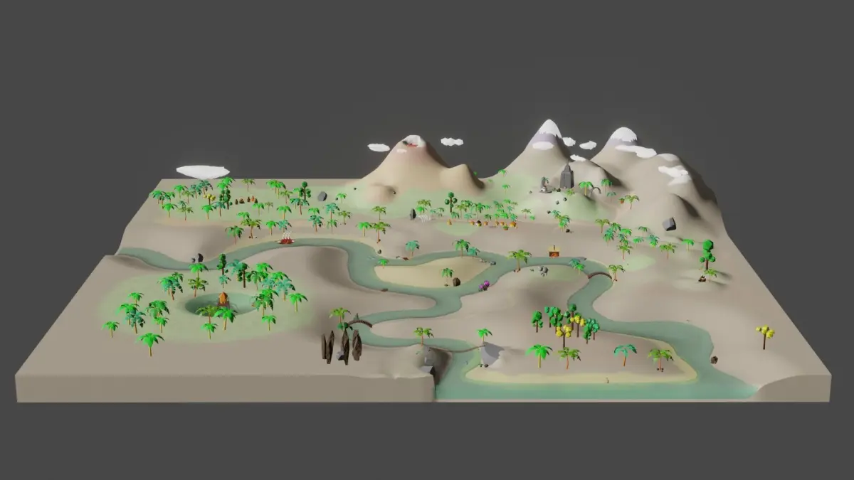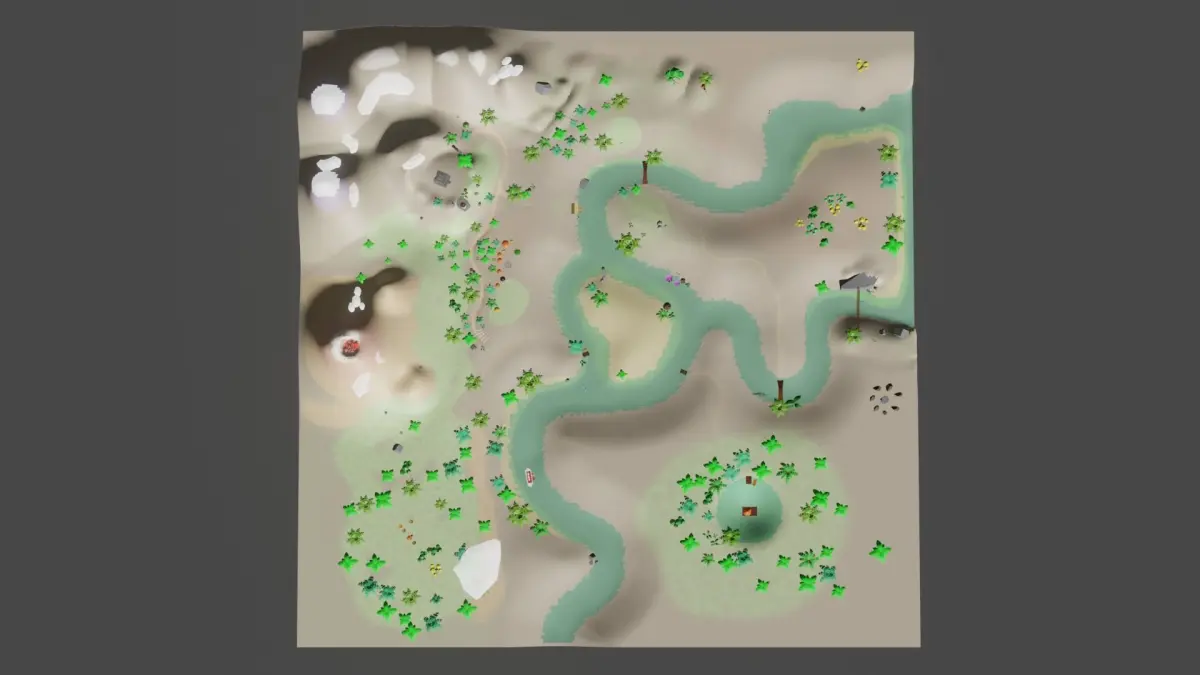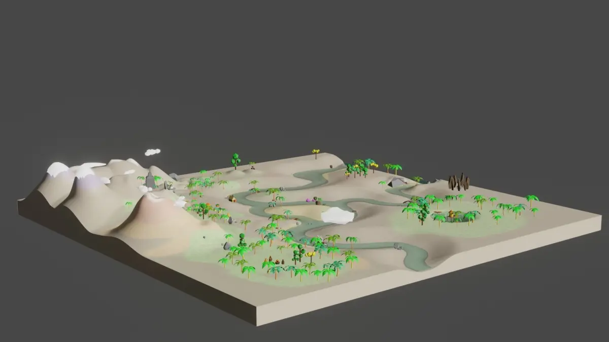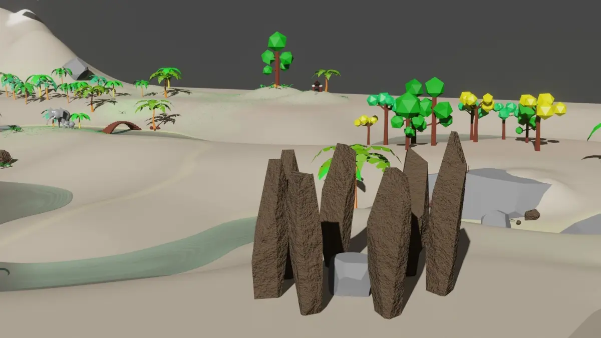- huts: hut1 [99 Polygons 111 Vertices], hut2 [66 Polygons 70 Vertice]s, hut3 [20 Polygons 23 Vertices], hut4 [34 Polygons 52 Vertices],hut5 [48 Polygons 85 Vertices], main hut [264 Polygons 280 Vertices]