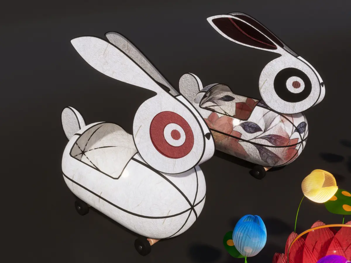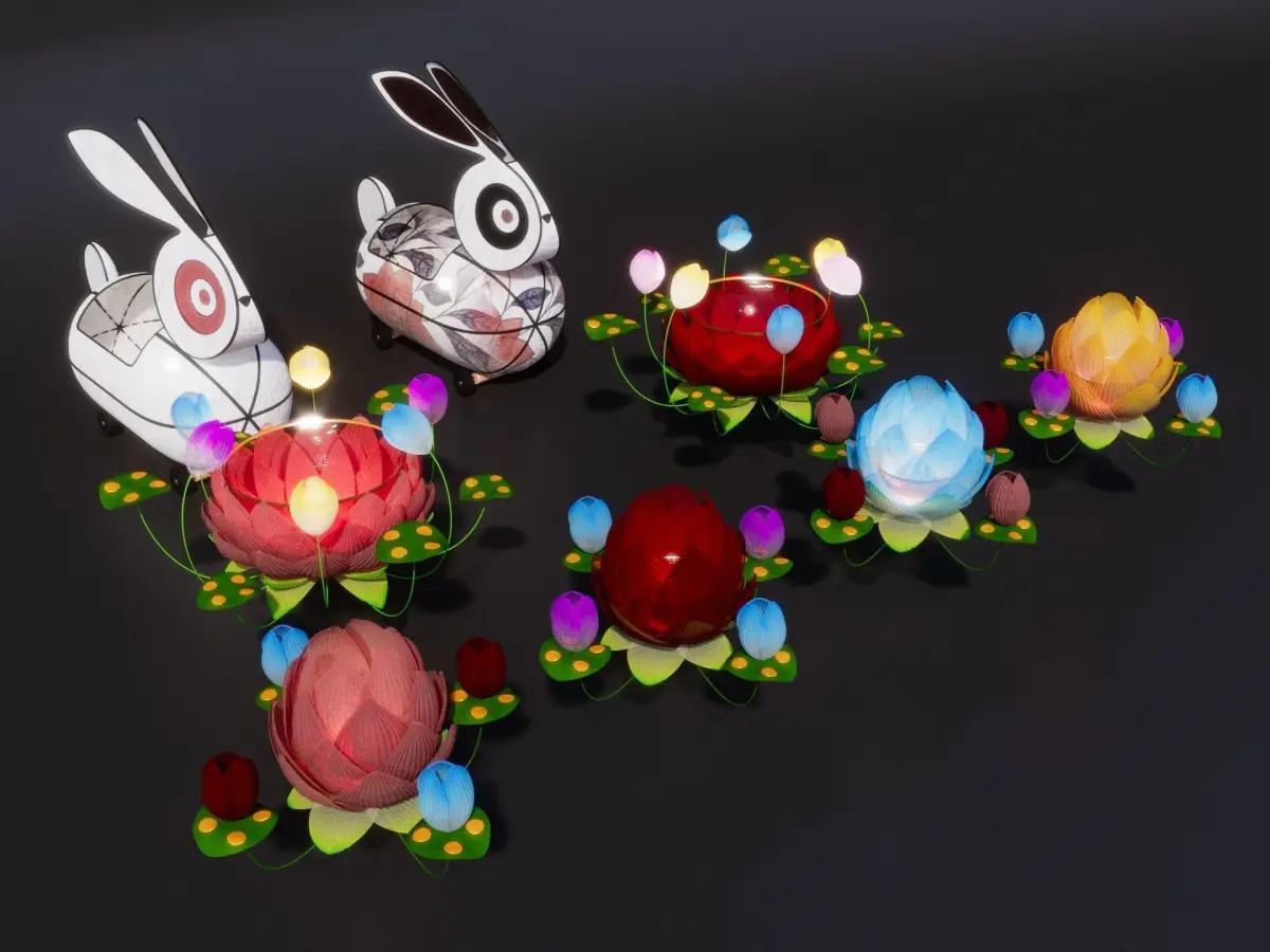 These lotus lanterns are a form of lantern unique to Nanjing, China. They are usually used during the Chinese New Year and Lantern Festival to decorate rooms or for children to play with. These lanterns are made of bamboo, wire, and paper. Candles are used as the light source. Rabbit lanterns are a widespread form of lantern in China, and usually have wooden wheels underneath so that children can drag them around.