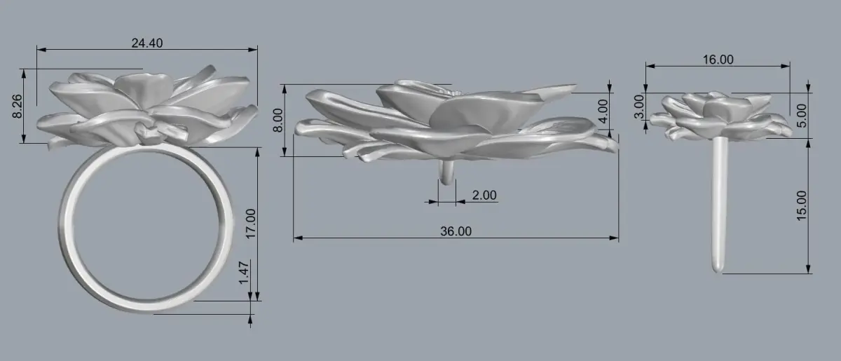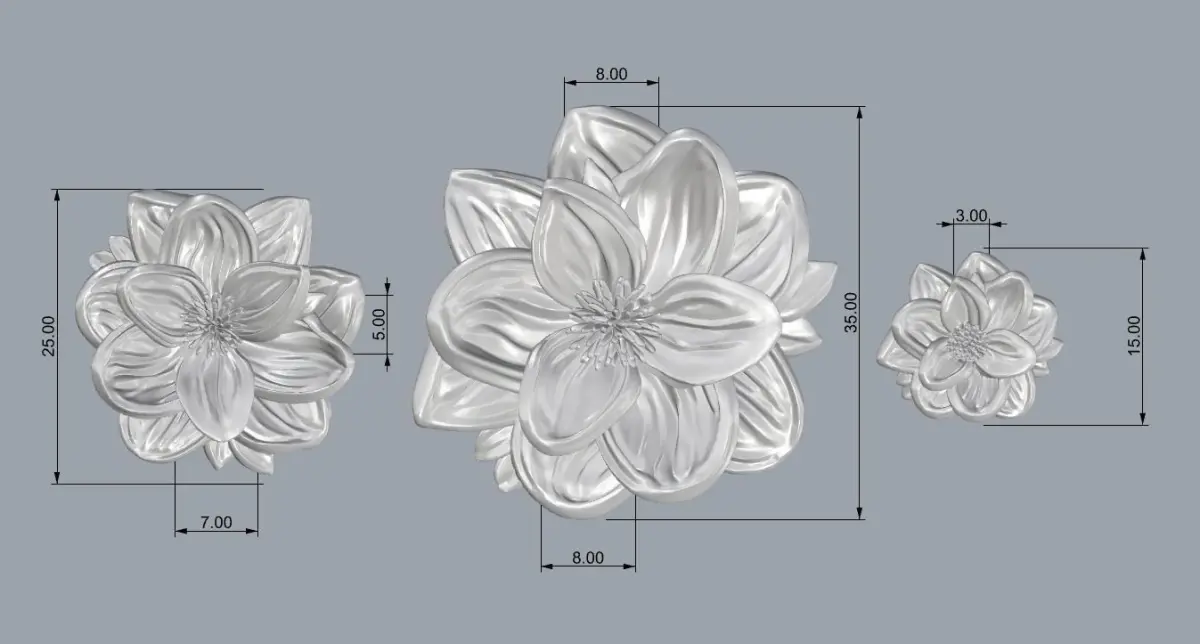 This Lotus Flower set has been designed and modeled in ZBrush and rendered by keyshot.____ It's print ready! ___ dimensions: pendant = 6.6cm / ring = 2.5cm / earing = 1.5cm - _____ Weight: pendant: gold 14k= 27gr / silver = 22gr ---Ring: gold 14k= 18gr / silver = 14gr---Earing: gold 14k= 5gr / silver = 4gr_____ I tried to put every version file you may need so if I missed something feel free to tell me ____ If you needed any specific edit contact me, and I would do it for free___ note: all detailed info are in pictures.___ Feel free to contact me for converting it to any other accessories :)_ Contact me for ring resizes I would get it done as soon as possible and update the files for FREE! ___