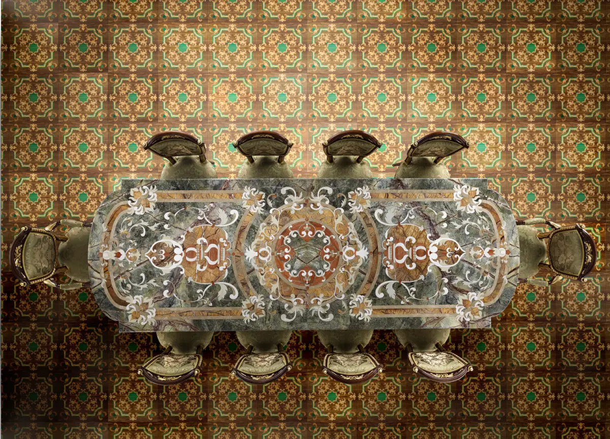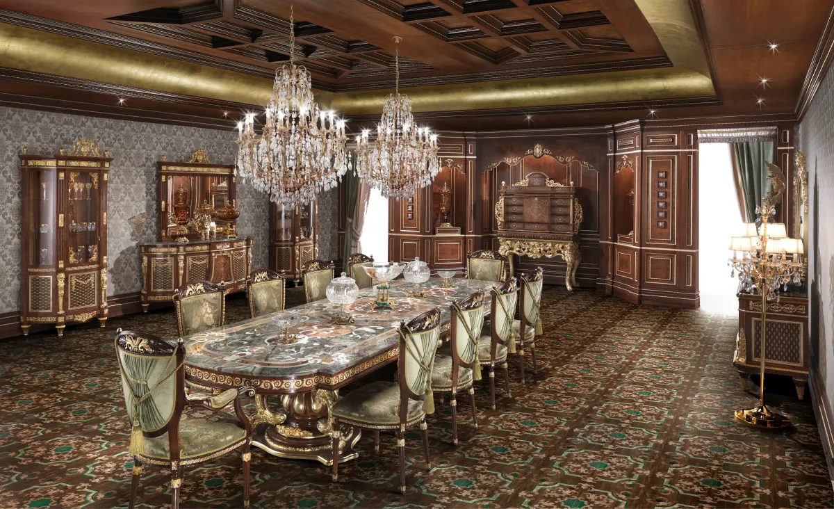 An extravaganza furniture with an excellency of design and handcraft represented in one piece. This luxury marble top dining table, crafted to perfection over the solid wood based. Hand carved from the highest quality of Italian marble from the best source, uniquely designed by our in house designer and own production. The wooden table base with extra details of curvy wooden motif around the grand pedestals. Perfect to be the centerpiece of your dining room to demonstrate the majesty of design.
