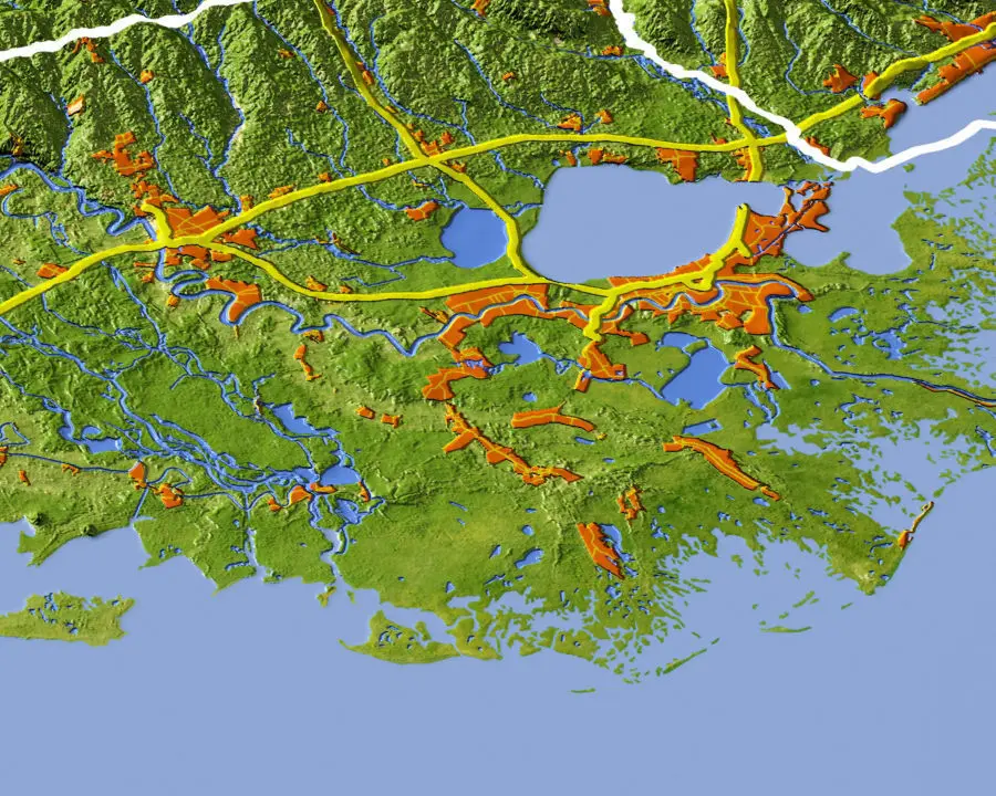 The set contains three models: a relief map of Louisiana with surrounding area, a separate relief cutout of the state area, and a separate plain cutoutof the state outline.