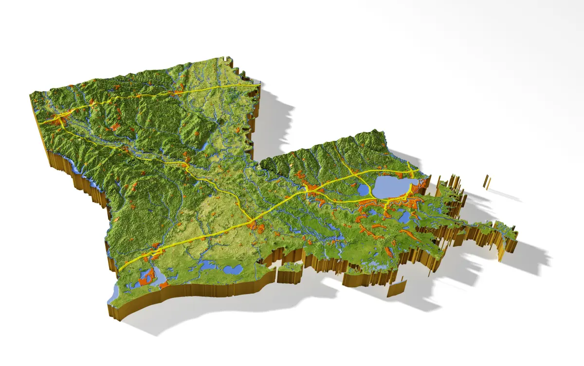 A multi-layered material (3ds Max version only) together with the provided texture masks allows extensive changes to the appearance of the map.Possible customizations include different colorings or complete removal of separate features like cities or borders, or different colorings forthe state area and the surroundings.