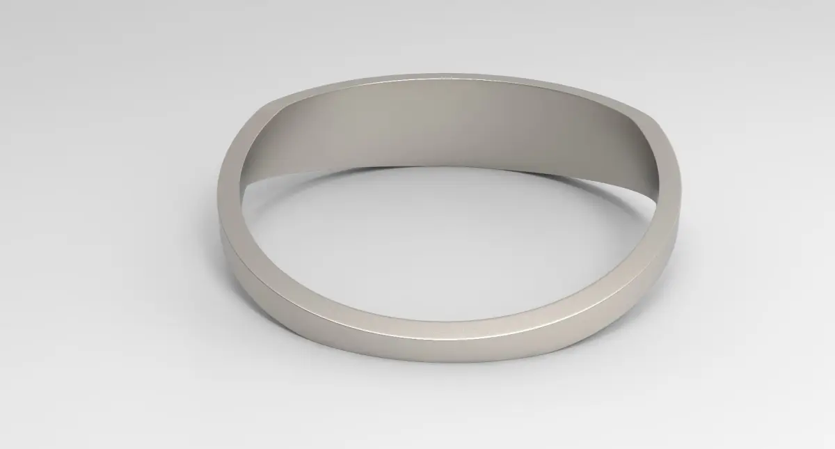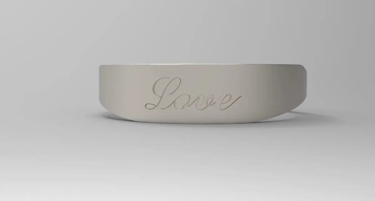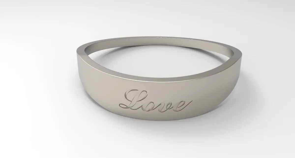 Ring Diameter = 20mm, Thickness = 2mm, Height = 5mm, Taper Height = 2mm to 5mm.Commercial Script BT Font, Text Depth = 0.2mm.