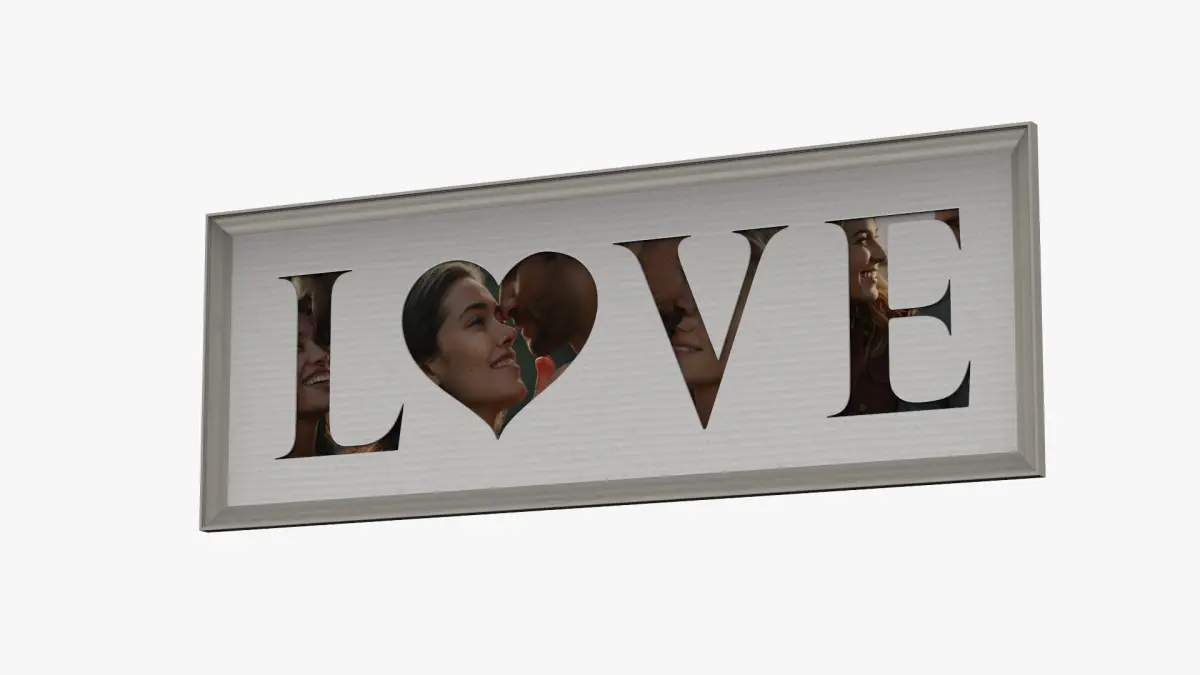 This 3D model represents a decorative photo frame featuring the word LOVE cut out, with the O replaced by a heart shape. The interior of the letters is filled with images, creating a personalized photo collage effect. The frame has a sleek and elegant design, with a metallic or light wood finish.