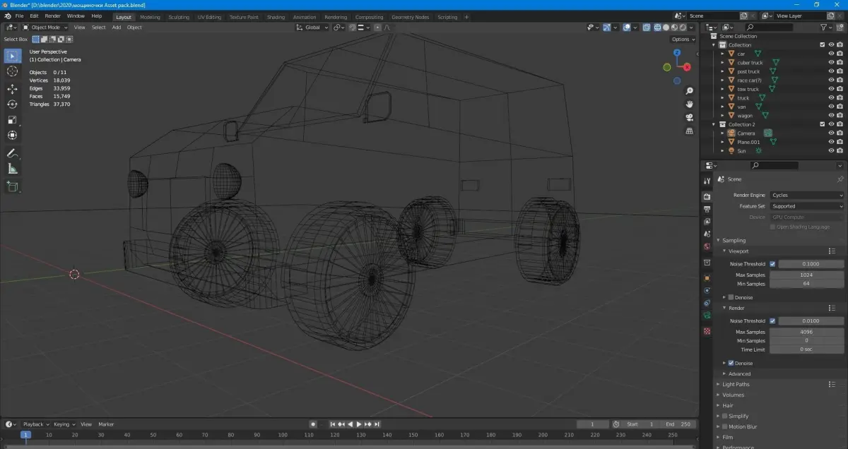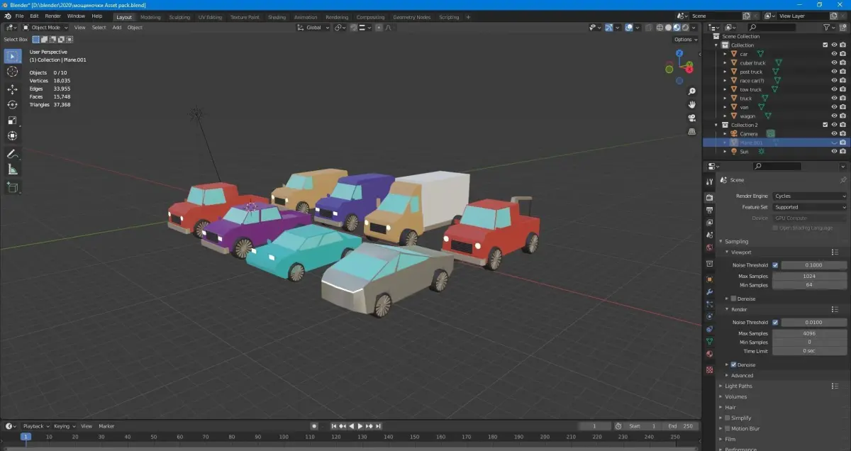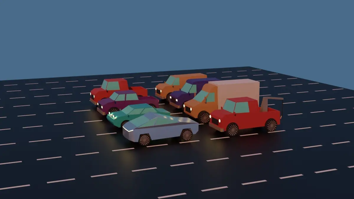 Low polly Asset pack with cars. There are: purple wagon,metalic Tesla cybertruck, red tow truck, blue sportcar, yellow truck , wan. This Asset pack is suitable for game developers, for making low polly mobile game.