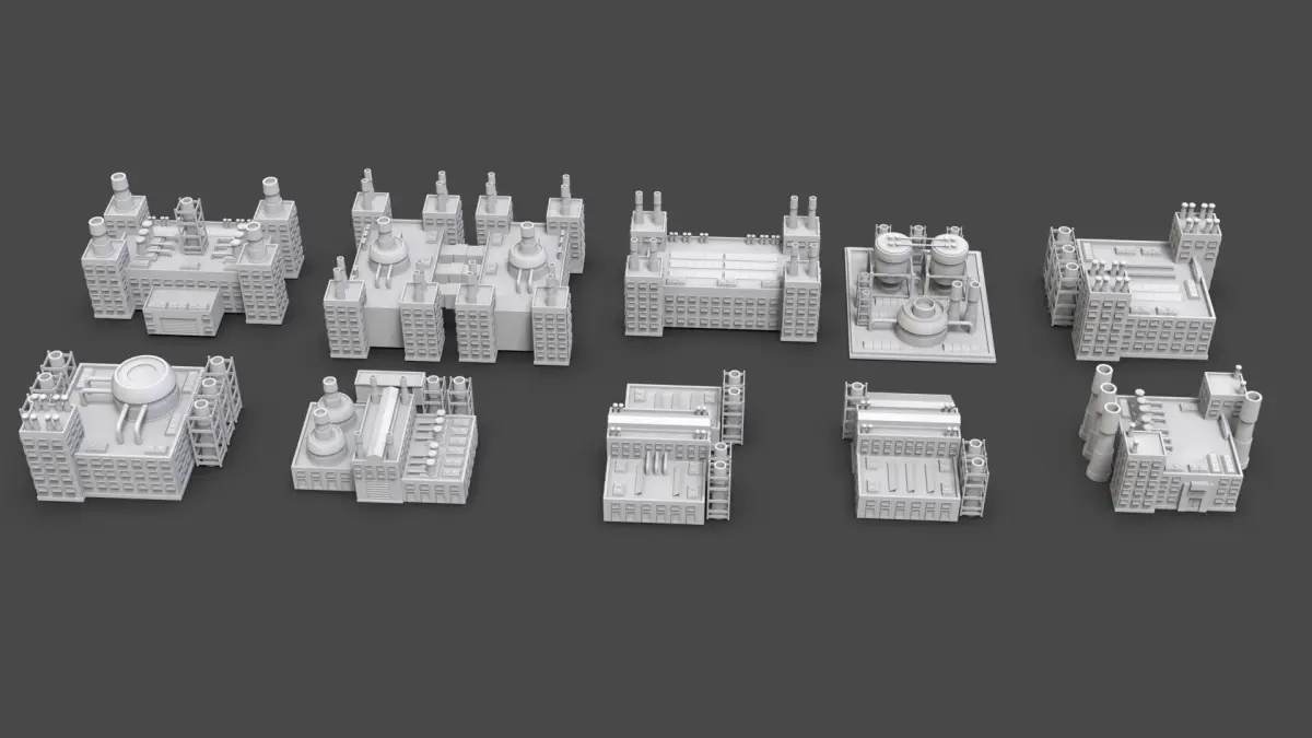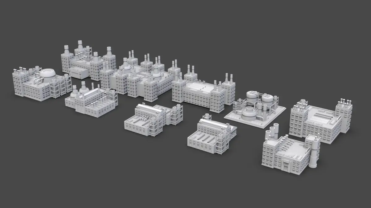 80 Industrial Buildings Pack: https://www.cgtrader.com/3d-models/exterior/industrial-exterior/low-poly-industrial-building-pack-of-80-game-ready-untextured