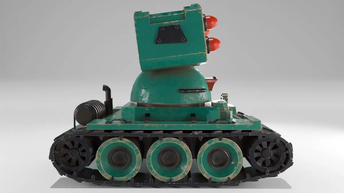 A low-poly 3D model of an anti-aircraft gun in a cartoon style. Modeled in blender, substance painter textures. Textures 4k
