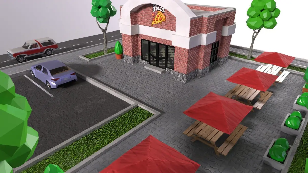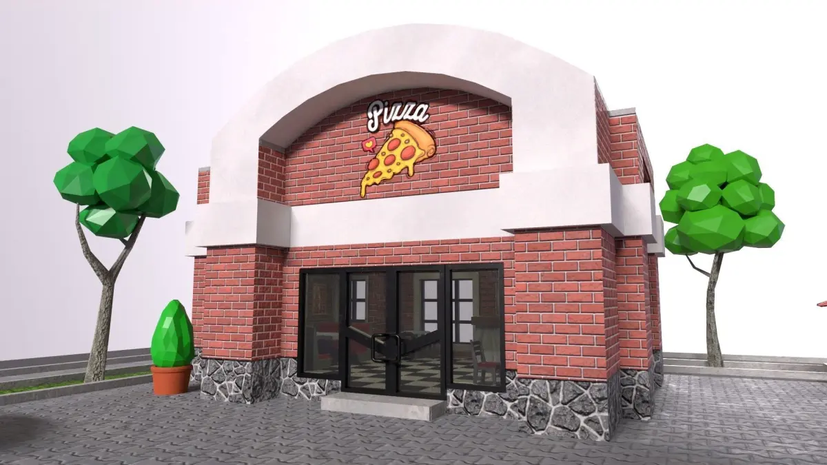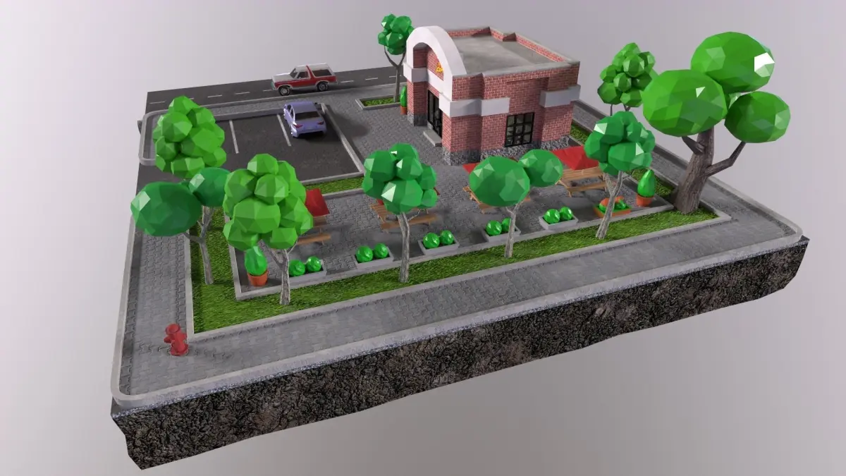 The low-poly 3D PBR set includes a piece of land with a street, a pizzeria, four types of trees, two types of bushes and 2 low poly cars - a sedan and an SUV. The model has a good level of detail on the interior and exterior of a cafe and two cars, includes PBR textures (BaseColor, Height, NormalMap, Metallic, Roughness, Opacity). Despite the high detail, the model is not heavy and will open even on a weak computer. Easy can be used in animations and games. The set of models was made in 3ds Max (max, obj, fbx) and rendered in marmoset toolbag 4.