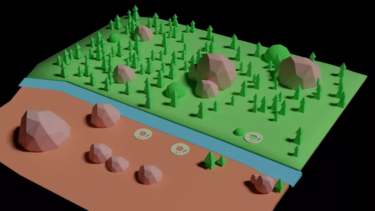This low poly 3D world is a stylized environment featuring a natural landscape divided by a flowing river. The scene includes dense forests made of simple conifer trees, scattered rocks and boulders, grassy terrain, and a contrasting barren land area. The world is designed with a clean geometric aesthetic, making it ideal for games, simulations, prototypes, and stylized visualizations.