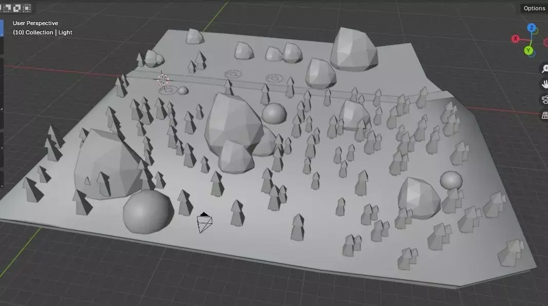 The environment uses optimized geometry and multiple materials to clearly separate terrain types such as grass, soil, water, trees, and rocks. Its lightweight structure ensures good performance while maintaining visual clarity and charm.