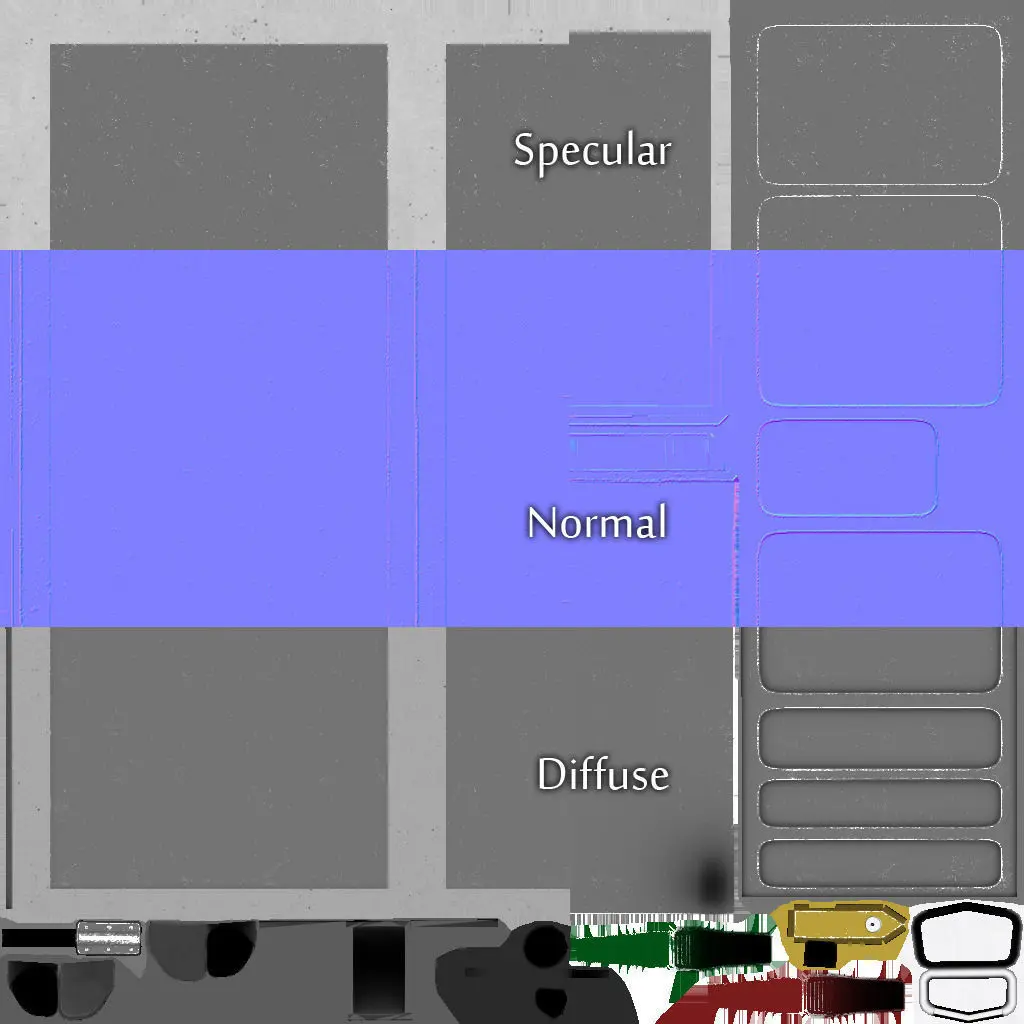 Diffuse: 1024x1024 in PNG formatNormals: 1024x1024 in PNG formatSpecular: 1024x1024 in PNG format