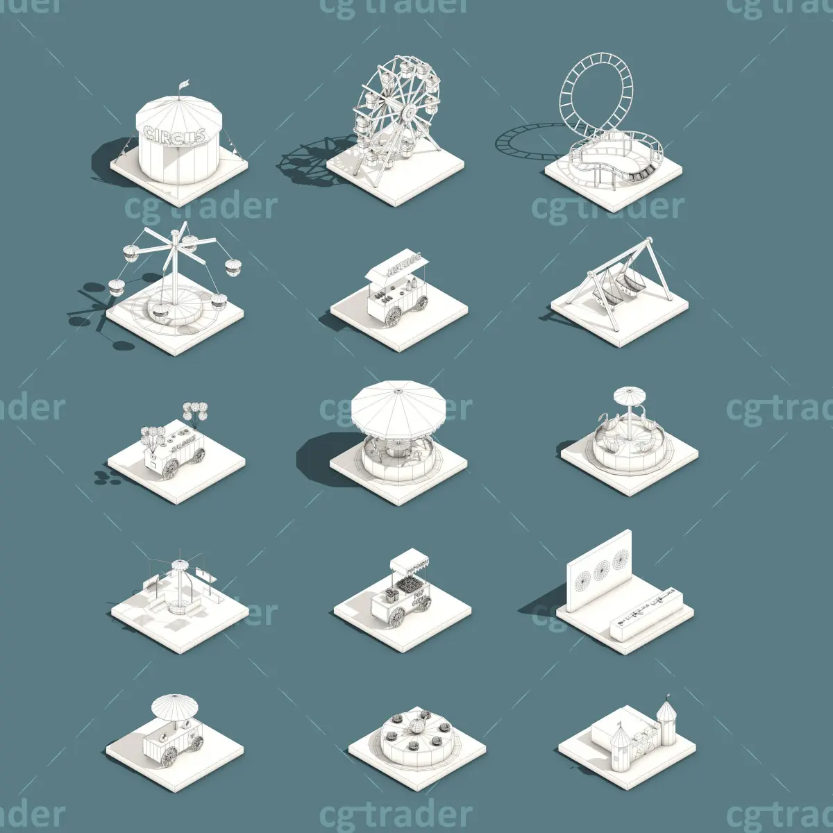 Rendering standard in Cinema 4D. Texture file size(2048*2048), You can easily adjust the color by dragging the uv. Model ready for game, render, make videos, motion graphics, inforgraphic, 3d map..e.t.c. This package contains: baloons, carousel horse, circus house, cup ferris, duck ferris, ferris, ferris chair, ferris wheel, horron house, hotdog shop, popcorn shop, roller coaster, shooting game, swing boat, vihicle cream.There are many other packages here: https://www.cgtrader.com/linkdo