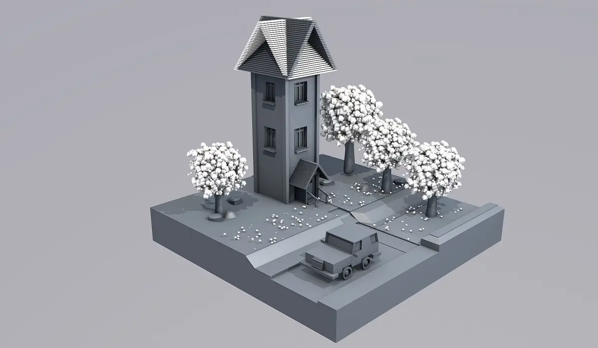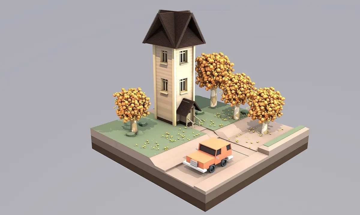 Low Poly - Antumn house with trees and car Low-poly 3D model