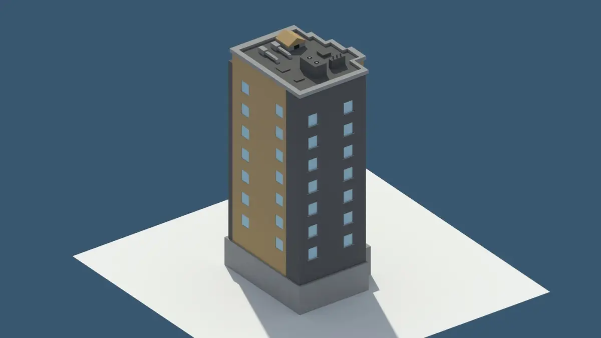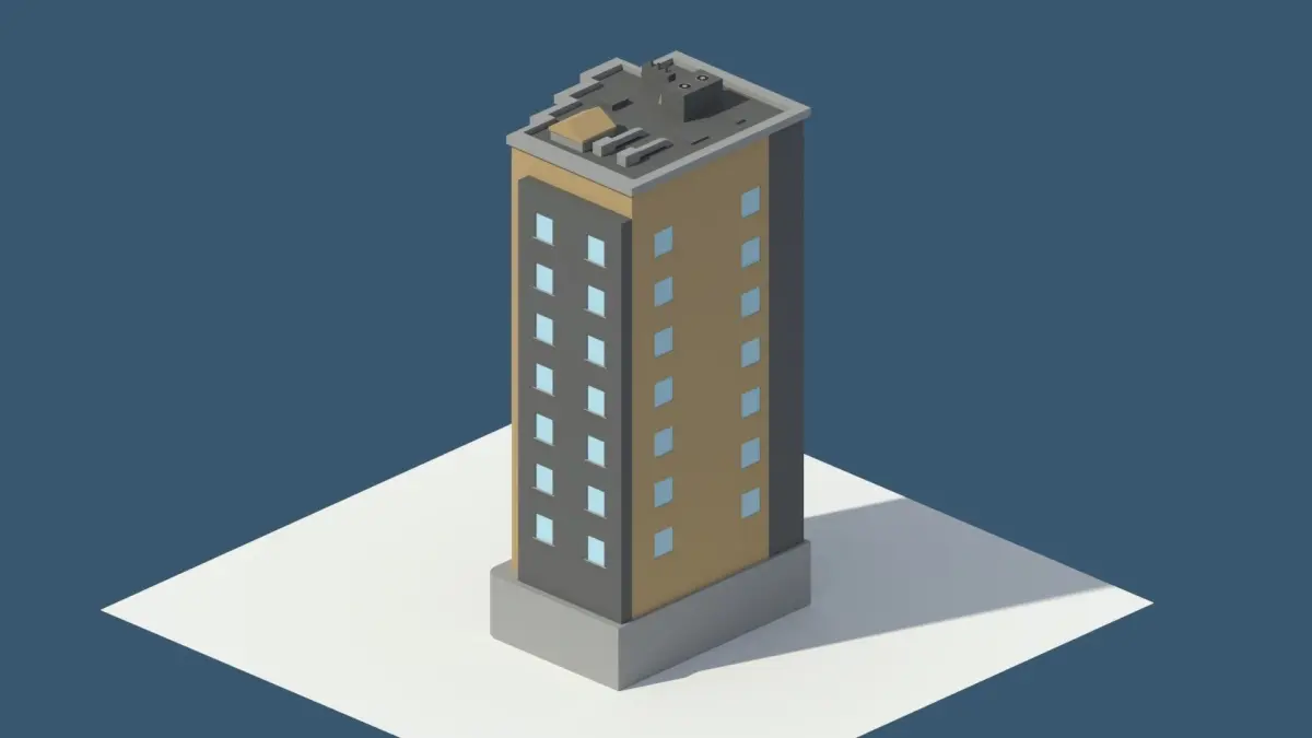 Pale yellow and grey low poly apartment building with balconies. Bunch of air ventilations and stuff on the roof.