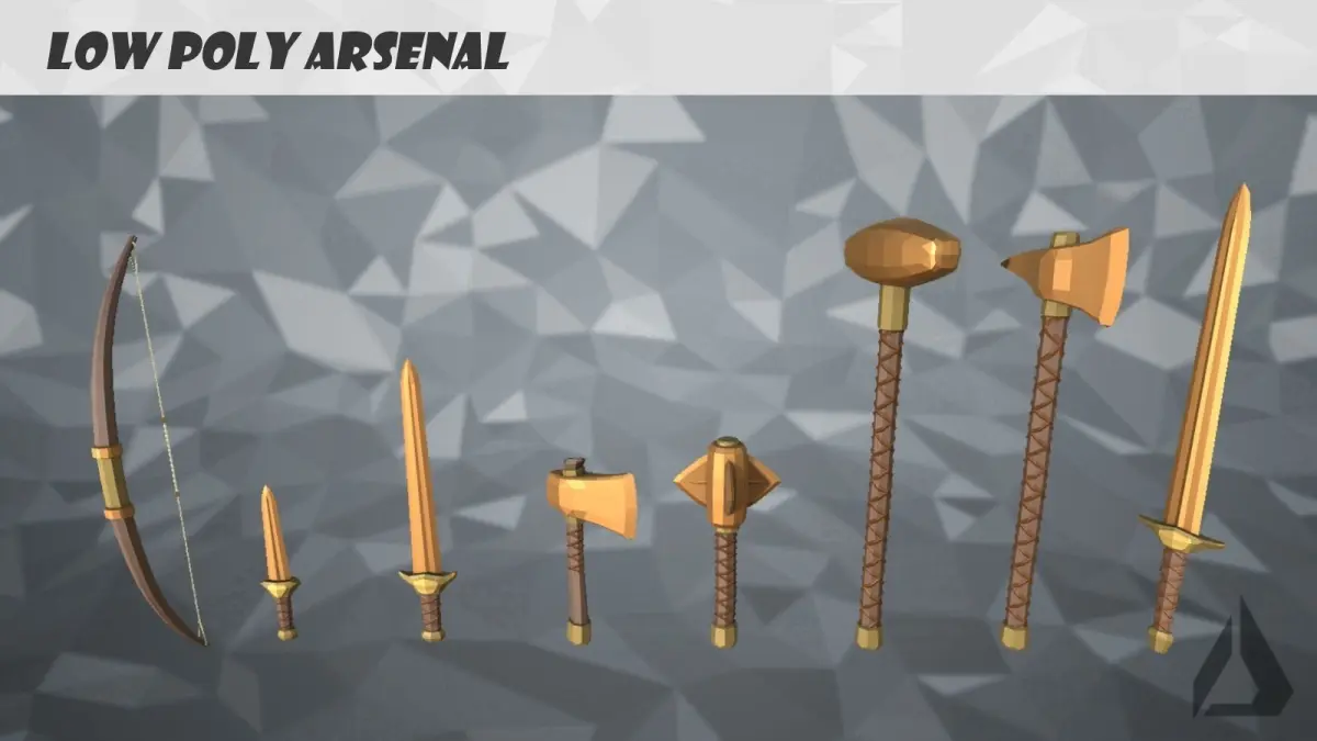 This low-poly styled Unity Package contains 8 weapons: 1 bow, 1 dagger, 1 sword, 1 axe, 1 mace, 1 hammer, 1 war axe and 1 greatsword, and 1 arrow for you to play around with and use in your Game project!