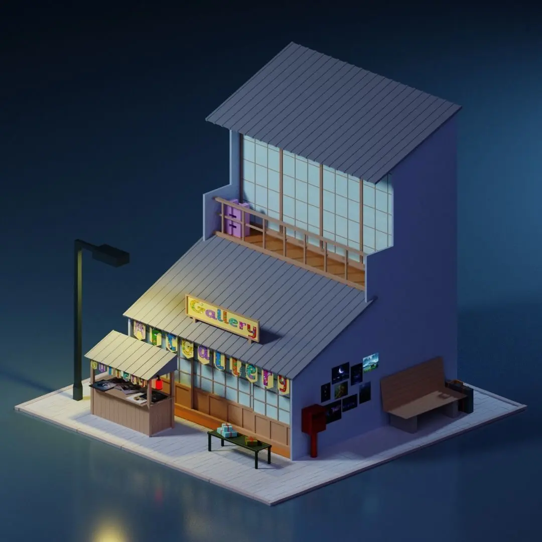This is a low poly stylized scene of a building called Art Gallery. It is available in multiple formats including .obj, .fbx, .stl and .blend with textures.It can be used for animation, games or printing.