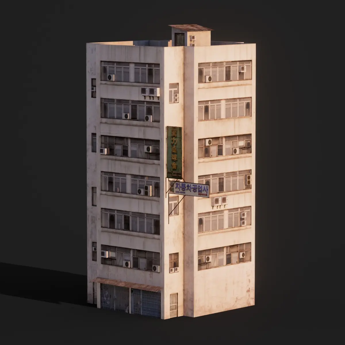 A low poly, asian tower block. Intended for background use in scenes where optomisation is key. I tried to make it look as photorealistic as possible, with the given constraints of it being low poly.