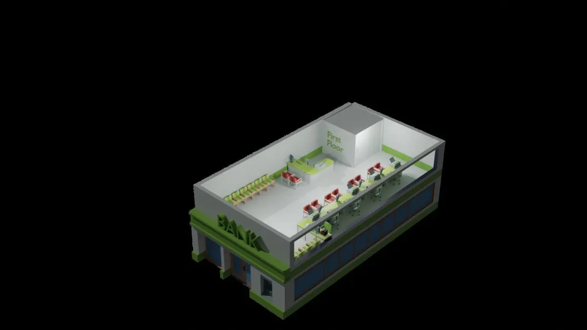 3D Model of a Bank made for games with low poly style. The assets are structured simply structured in the following folders: Groun_floor, 2nd_Floor,1st_Floor.The model contains a Bank with three floors with interior included, with desks and chairs and computers and elevator... etc.