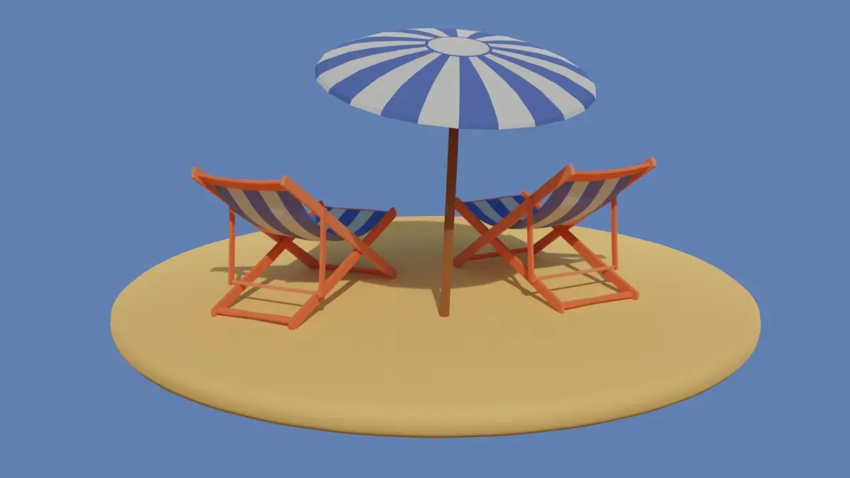 This scene consists of two deck chairs, a parasol and a piece of sand. The models are designed in a low poly style with a lot of little details and imperfections. This creates a charming and cartoony look.