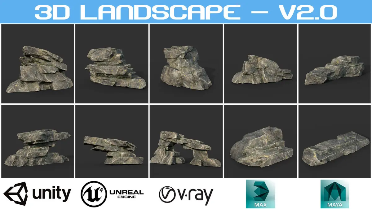 Rock 01: 10000 polys, Rock 02: 5000 polys, Rock 03: 10000 polys, Rock 04: 7000 polys, Rock 05: 5000 polys, Rock 06: 5000 polys, Rock 07: 8000 polys, Rock 08: 2000 polys, Rock 09: 2000 polys, Rock 10: 8000 polys,