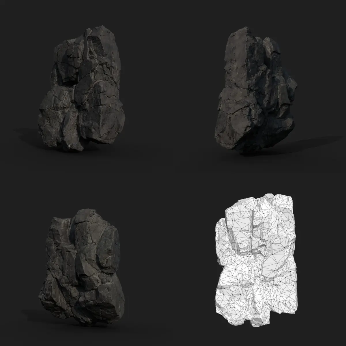 - Polycount: This product features 8 Low poly Black Modular Rock models with approximately 6000 polygons.