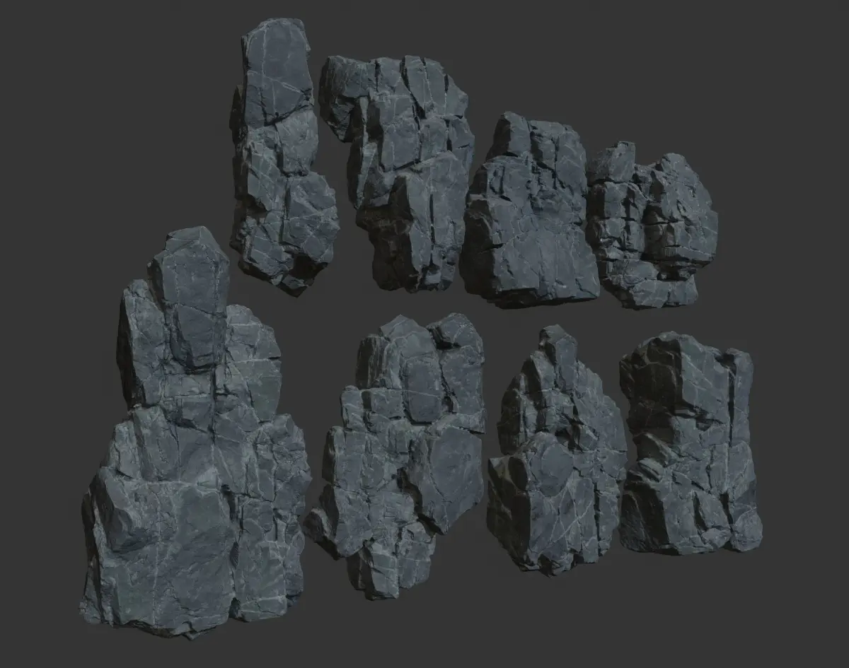 - Polycount: This product features 8 Low poly Black Modular Rock models with approximately 6000 polygons.