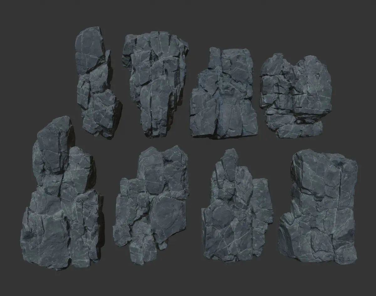 This product consists of 8 3D models of rock formations. The shape of this rock is relatively flat with many cracks, and the edges are quite sharp, giving a sense of hardness to the rock. The details of the model are depicted in all different angles, so you can replicate them, then rotate, flip, scale to combine them and create a variety of shapes.