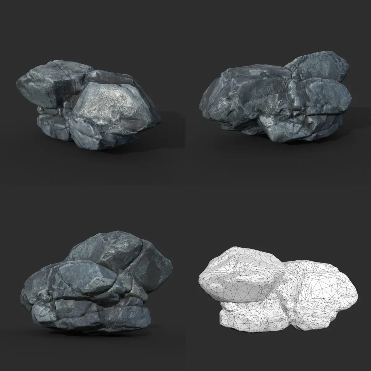 This product consists of 8 3D models of rock formations. The shapes are relatively round, with edges worn by weather and environmental factors. These rock shapes are commonly found in geographical features such as coastlines, riverbanks, or streams and waterfalls. The color of the rocks is a blue-grey, with a slightly glossy surface and occasional darker patches caused by dirt or dampness.