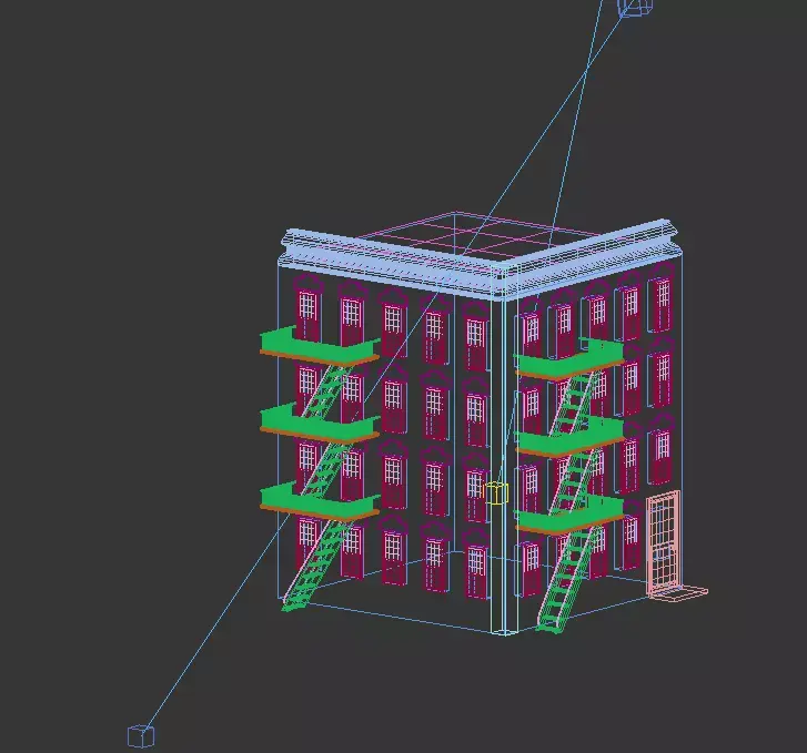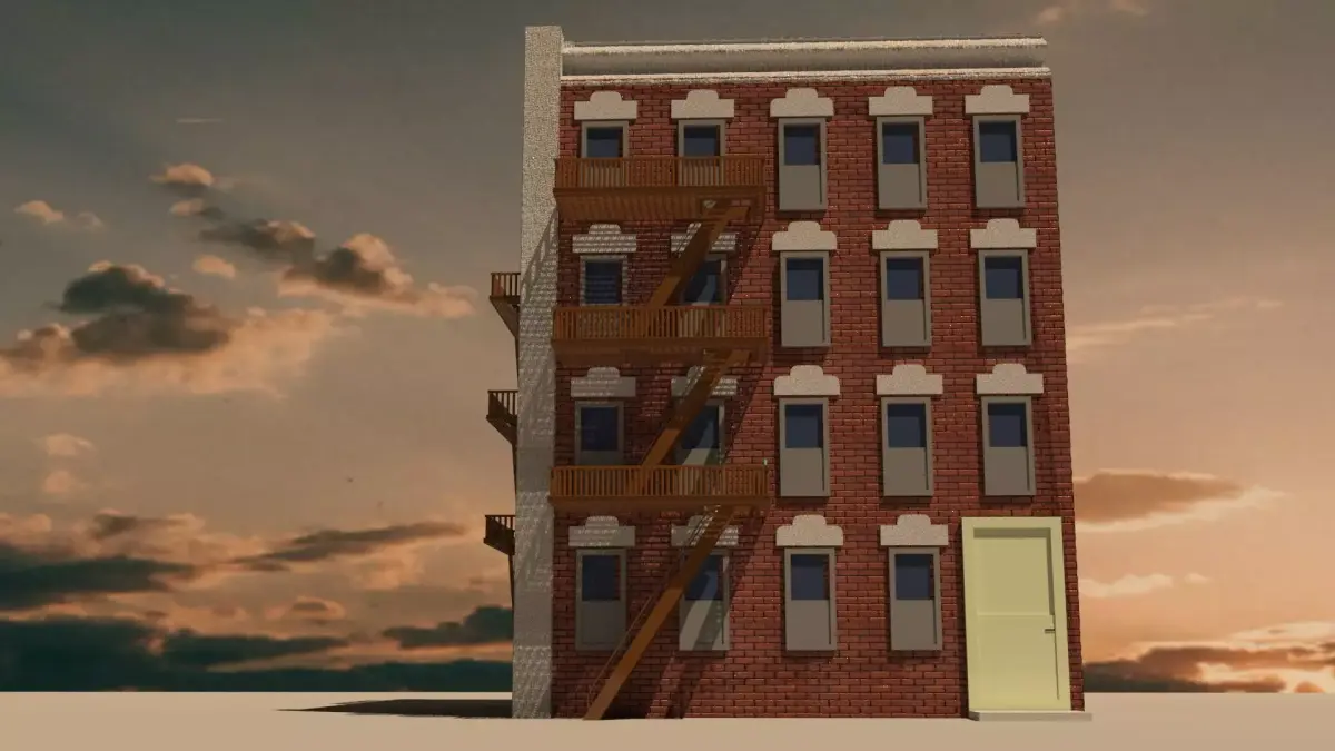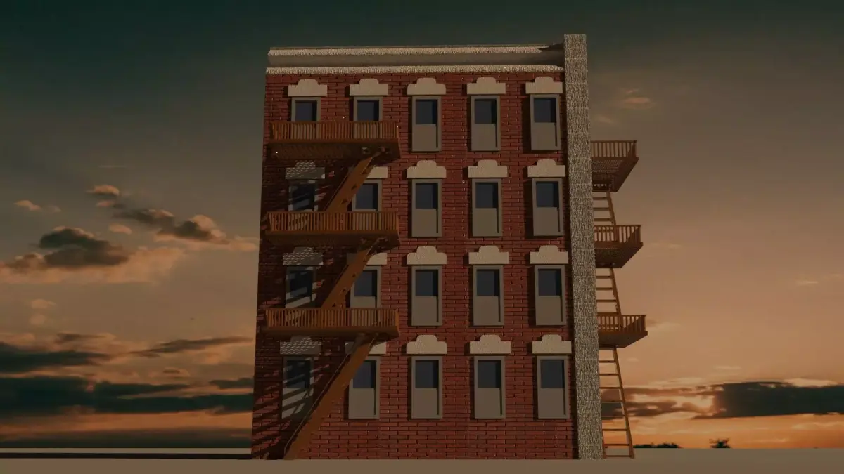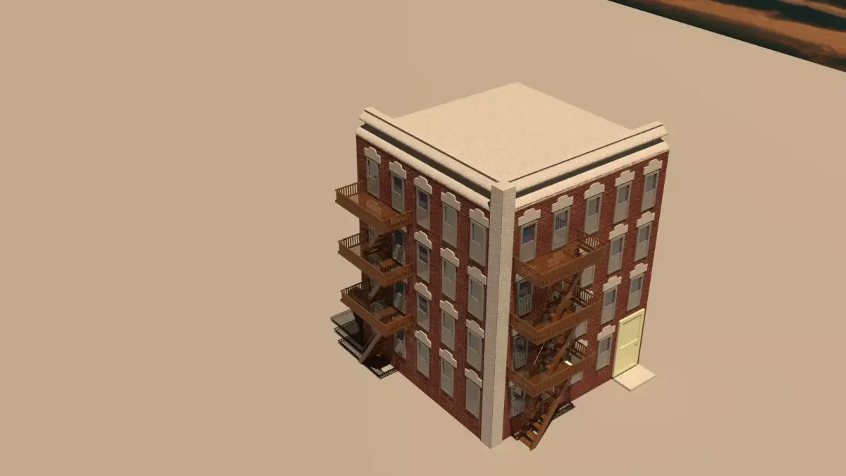 This is a detailed exterior 3D model of a brick apartment building inspired by classic urban architecture.The model features fire escape stairs and balconies, clean brickwork, and realistic proportions, making it suitable for games, architectural visualization, simulations, and city scenes.