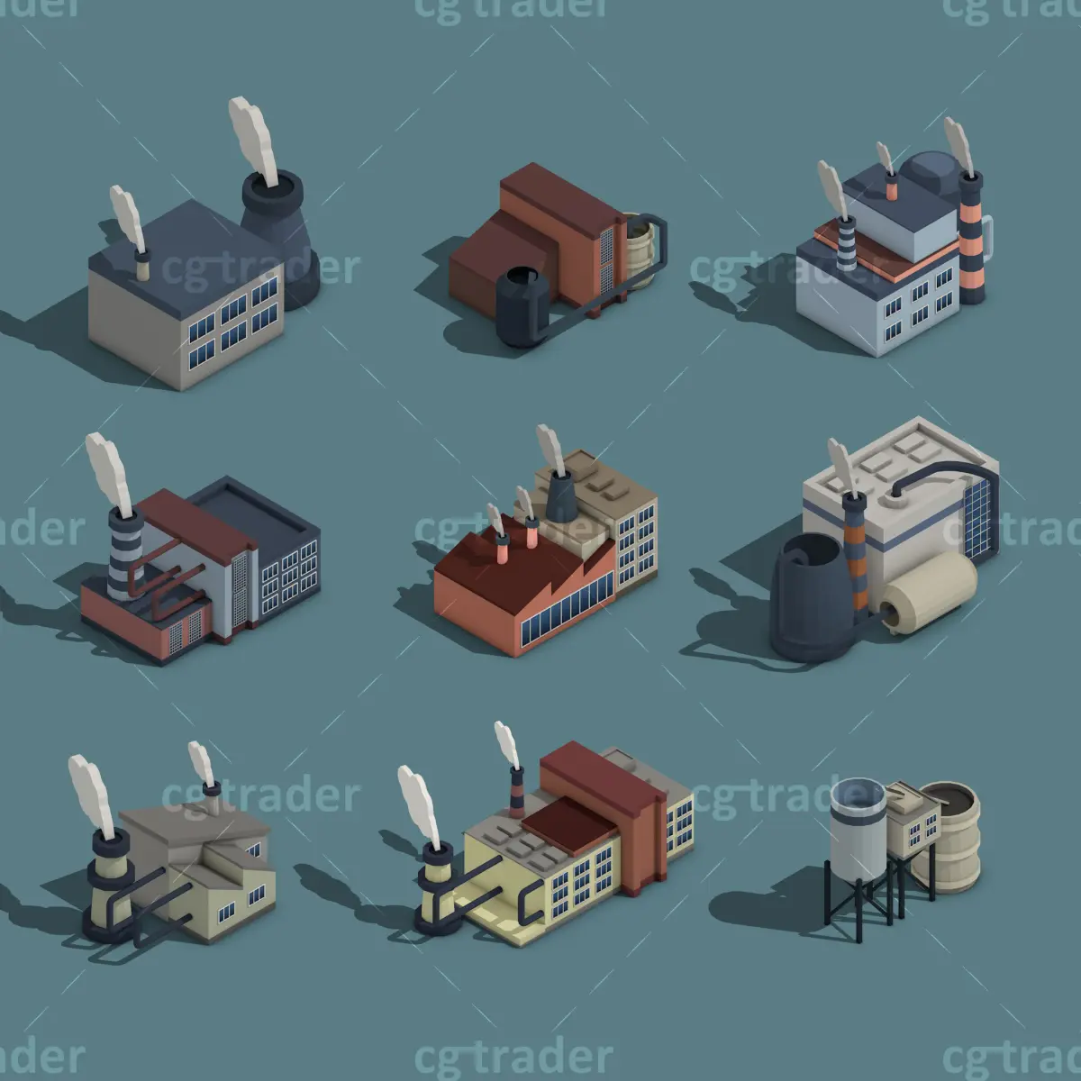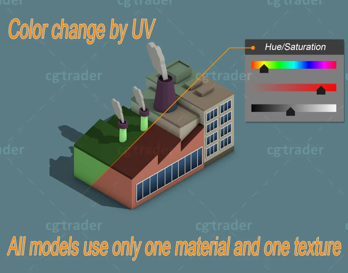 Rendering standard in Cinema 4D. Texture file size(2048*2048), You can easily adjust the color by dragging the uv. Model ready for game, render, make videos, motion graphics, inforgraphic, 3d map..e.t.c. This package contains: Industry building, factory. There are many other packages here: https://www.cgtrader.com/linkdo