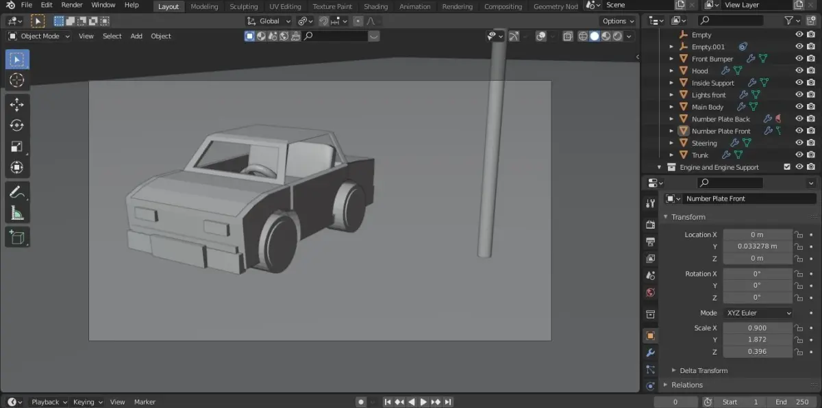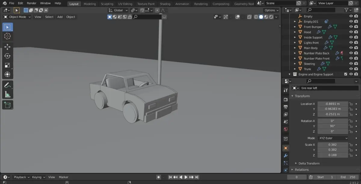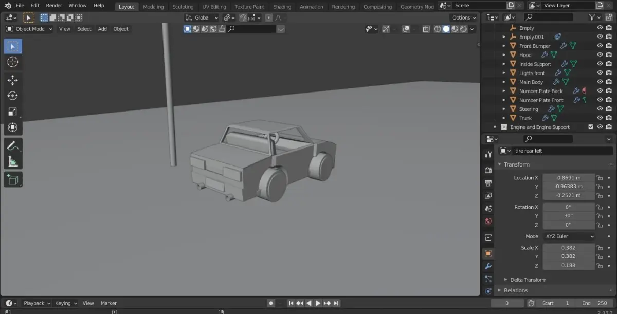 Low-Poly Car. Additional Info: The Model is Pre-rigged(Doors(LEFT,RIGHT),Trunk,Hood). You Can Change it according to your liking.Light added, 4 tires, Engine and Additional Engine support meshes, Seat, Simple steering.