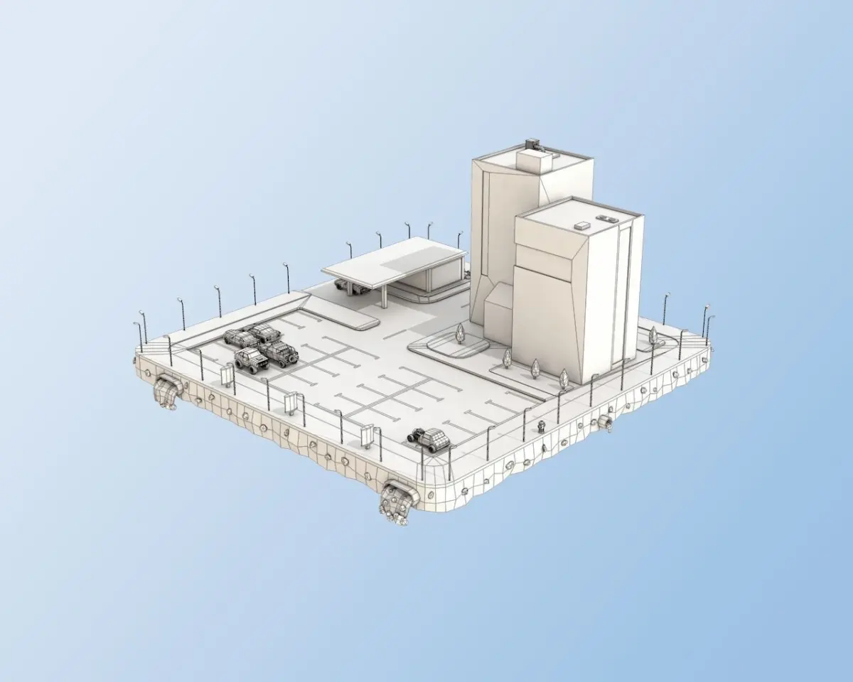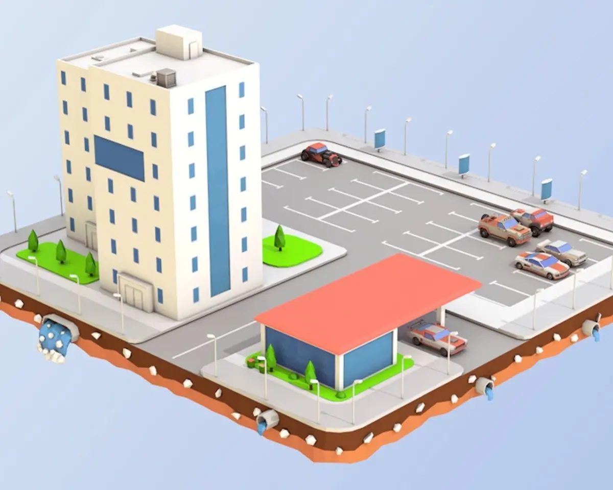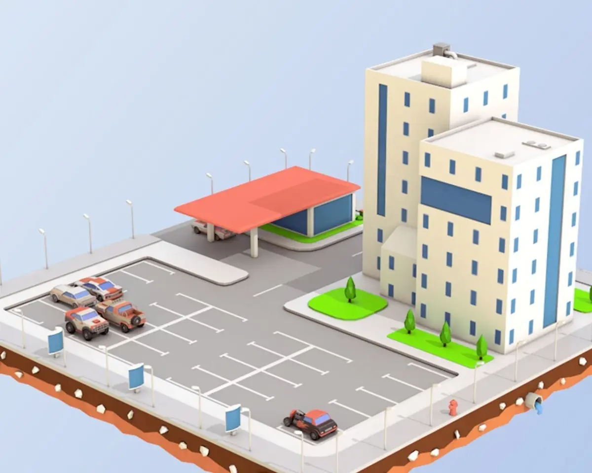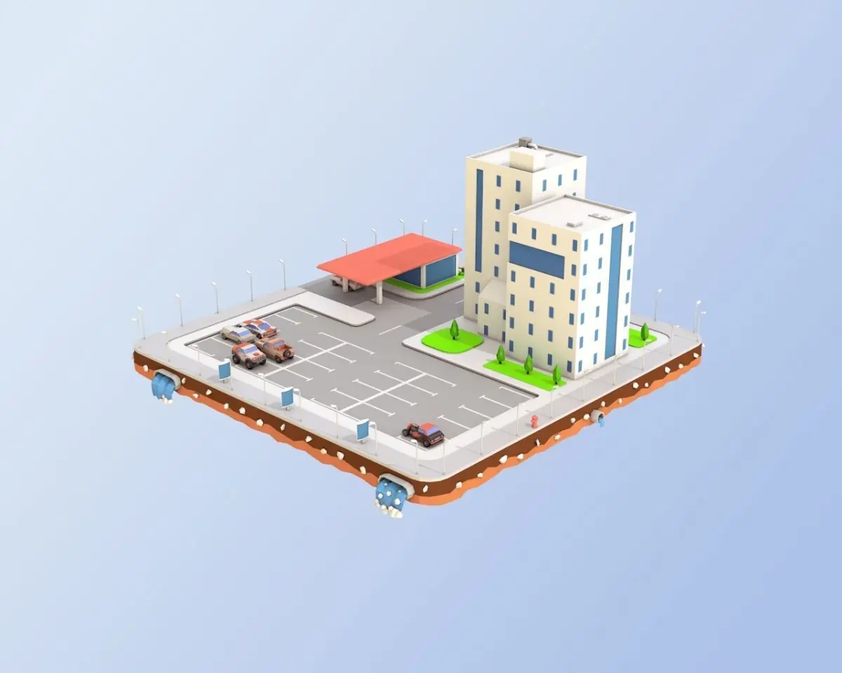 What Included In 3D Model ⦁Two Buildings⦁Six Low Poly Cars⦁Tress and bushes⦁Parts of exterior⦁Platform