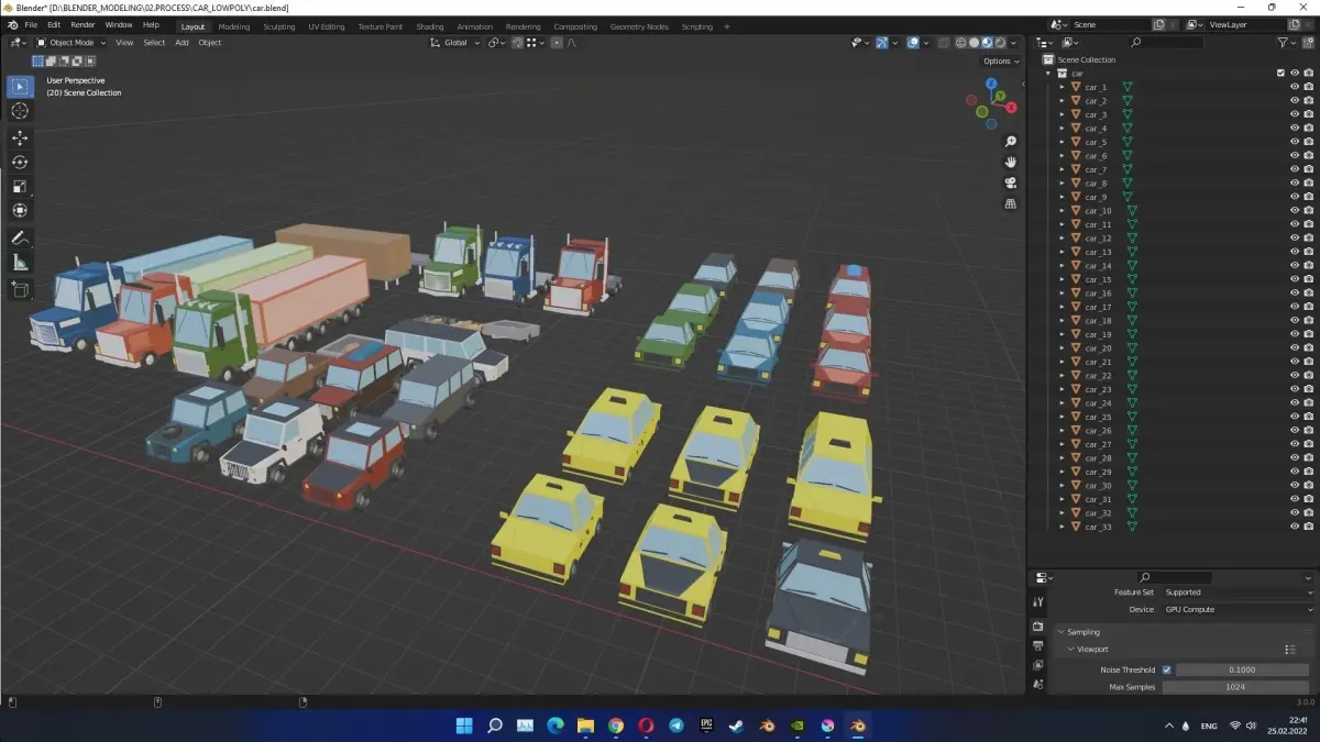 Full set of 33 low poly cars and trucks are named correctly and organized as individual.