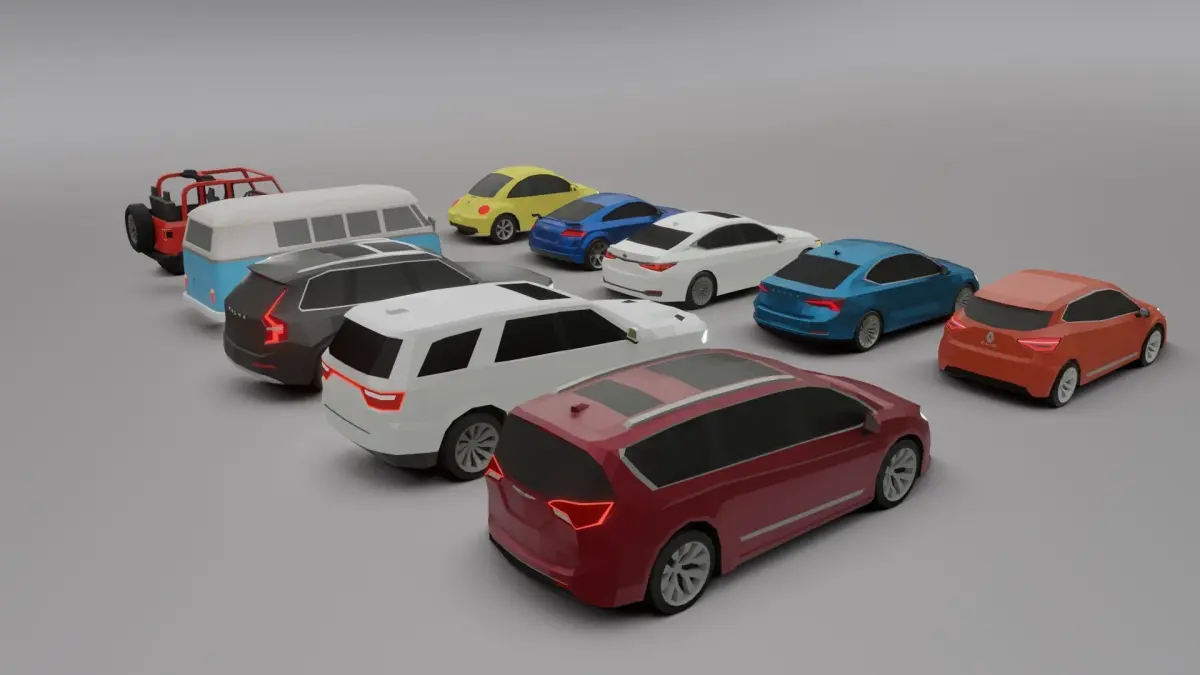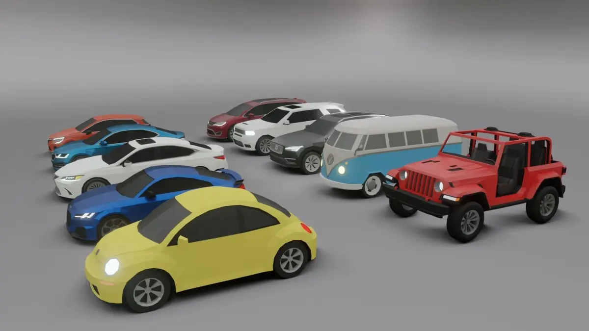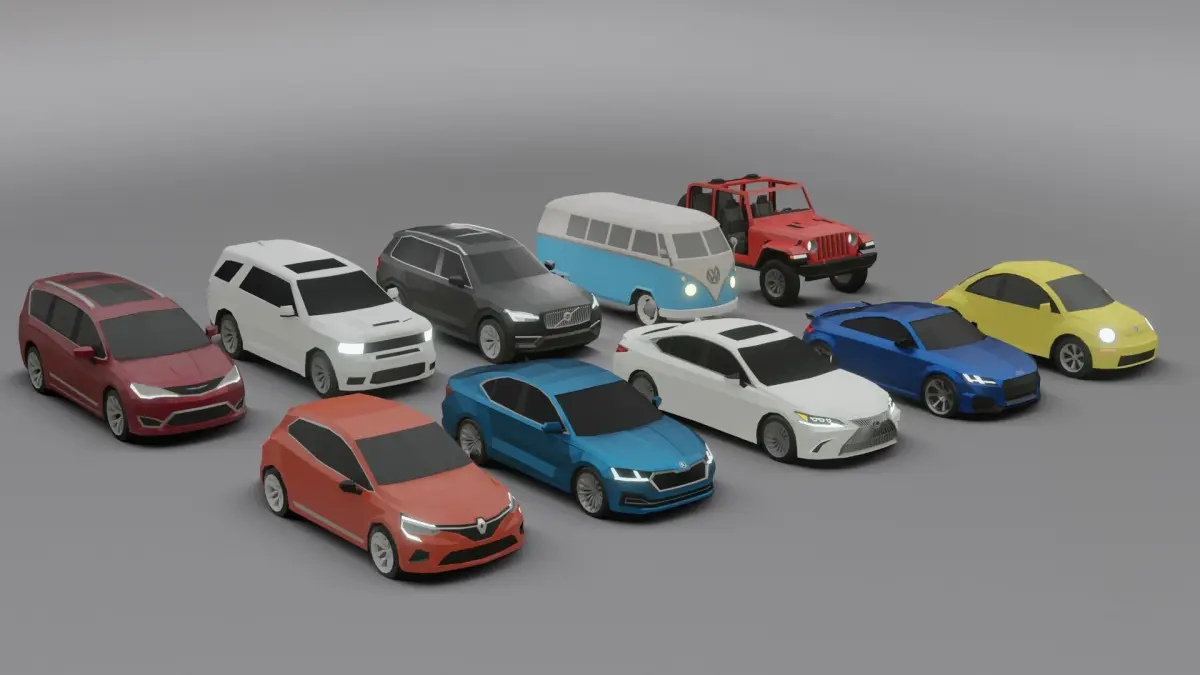 list of cars in this pack:Skoda Cctavia 2020 - 5646 faces, 5678 vertsLexus ES300 2020 - 5922 faces, 5989 vertsVolkswagen Type2 1967 - 3070 faces, 3138 vertsJeep Wrangler 2020 - 7435 faces, 7453 vertsVhrysler Pacifica 2020 - 3390 faces, 3374 vertsVolkswagen new beetle 2000 - 2648 faces, 2737 vertsAudi TT 2020 - 5623 faces, 5629 vertsVolvo XC90 2020 - 3576 faces, 3637 vertsRenault Clio 2020 - 2920 faces, 2887 vertsDodge Durango 2020 - 2786 faces, 2756 verts