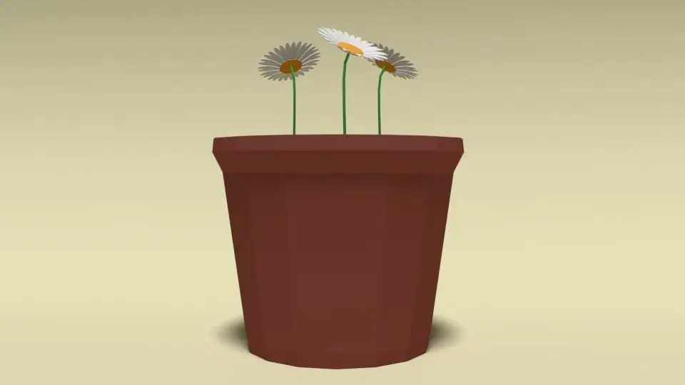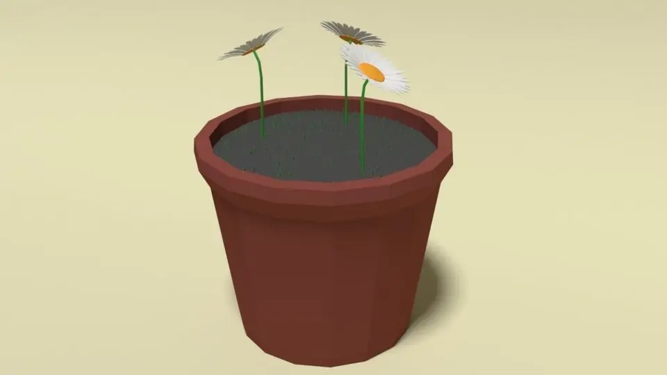 This is a low poly 3d model of a flower pot with 3 daisy flowers. The low poly flowers was modelled and prepared for low-poly style renderings, background, general CG visualization presented as a mesh with quads only.