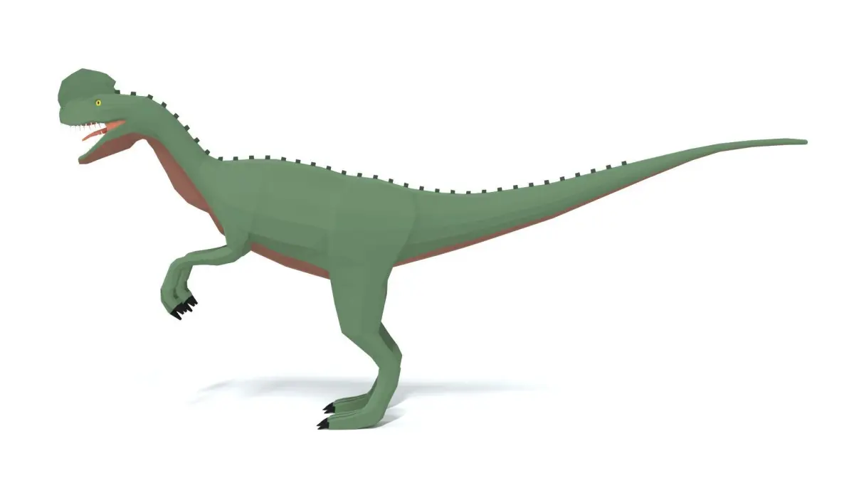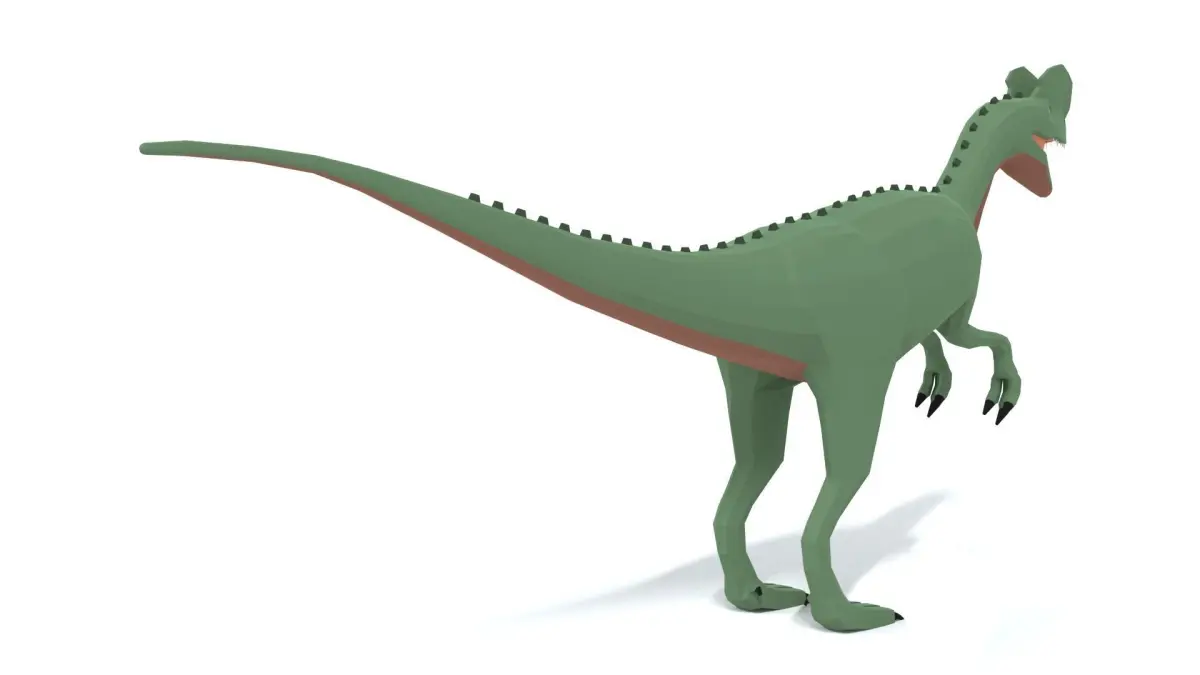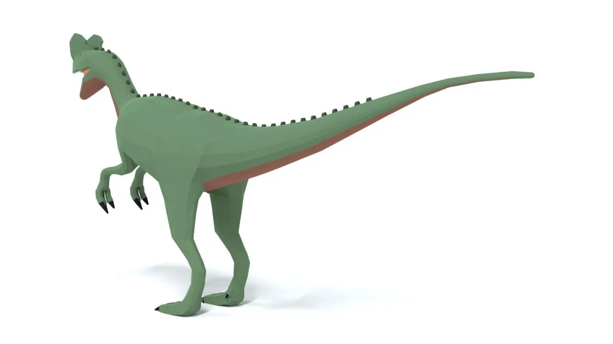 This is a low poly 3D model of a Dilophosaurus Dinosaur. The low poly dinosaur was modeled and prepared for low-poly style renderings, background, general CG visualization presented as 1 mesh with quads only.
