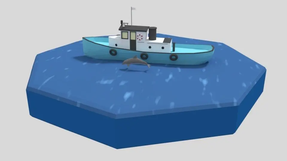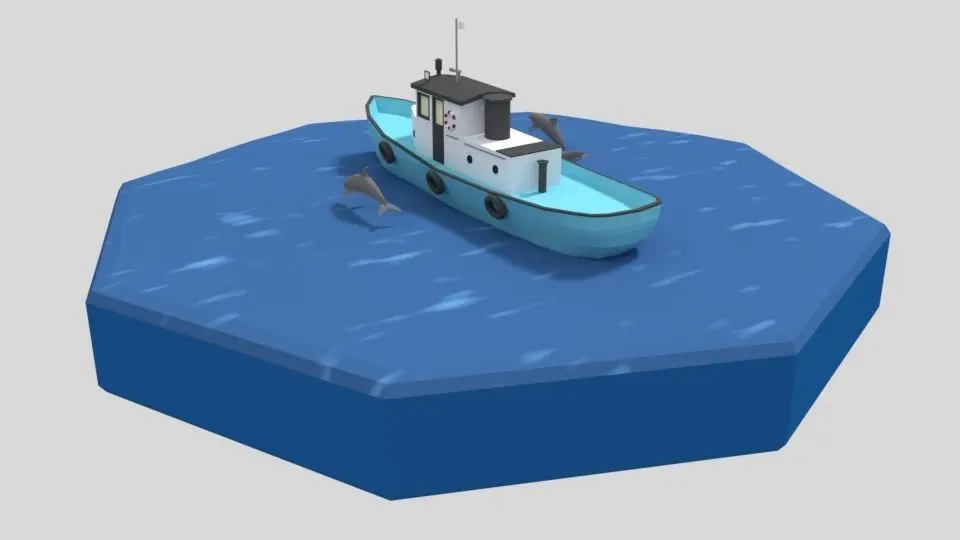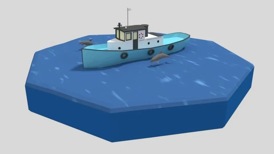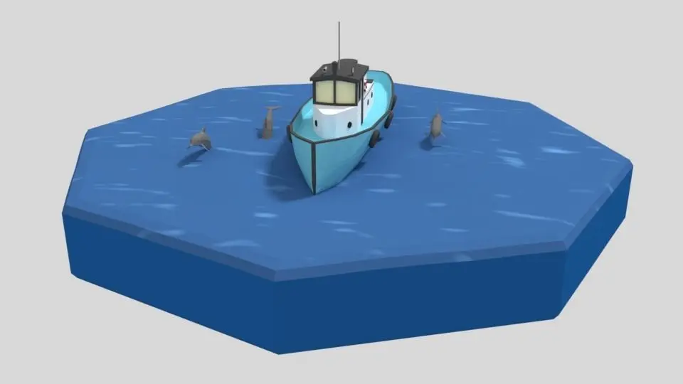 This is a low poly 3D scene of a fishing boat and 3 dolphins. The low poly scene was modeled and prepared for low-poly style renderings, background, general CG visualization presented as 5 meshes with quads only.