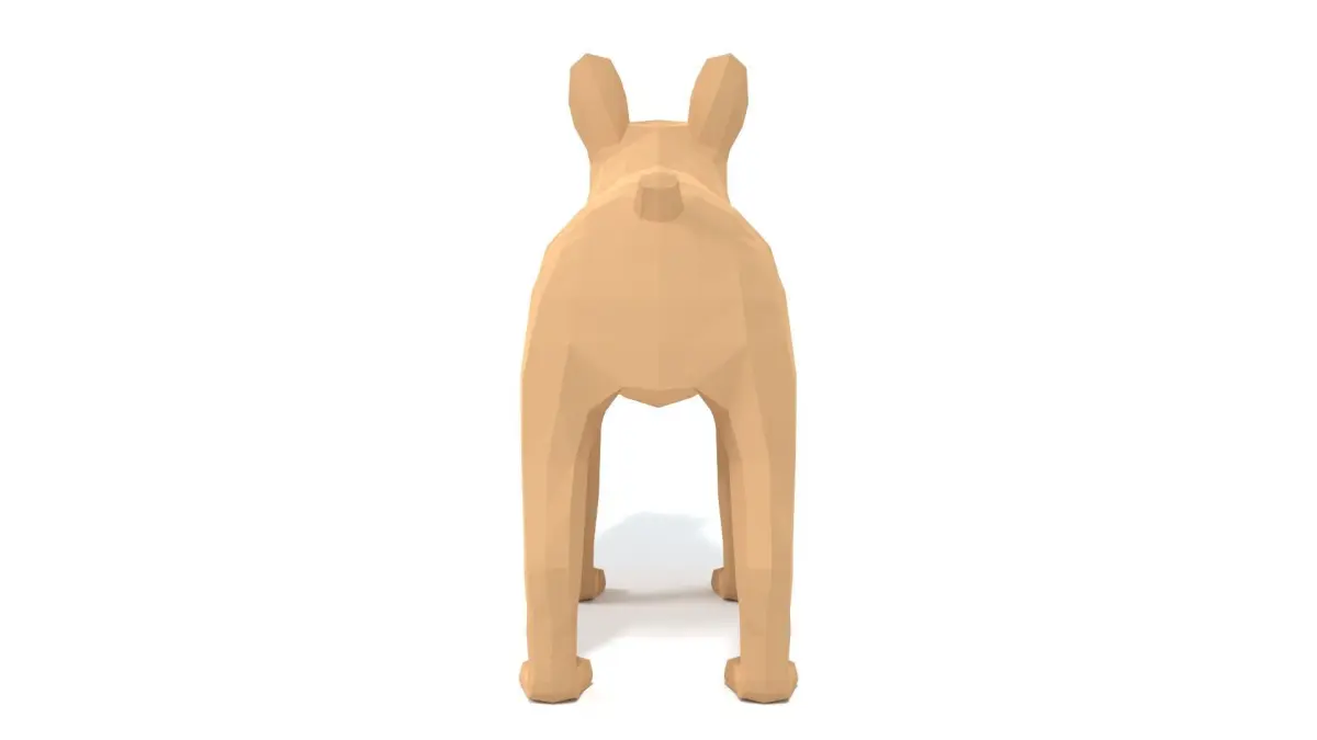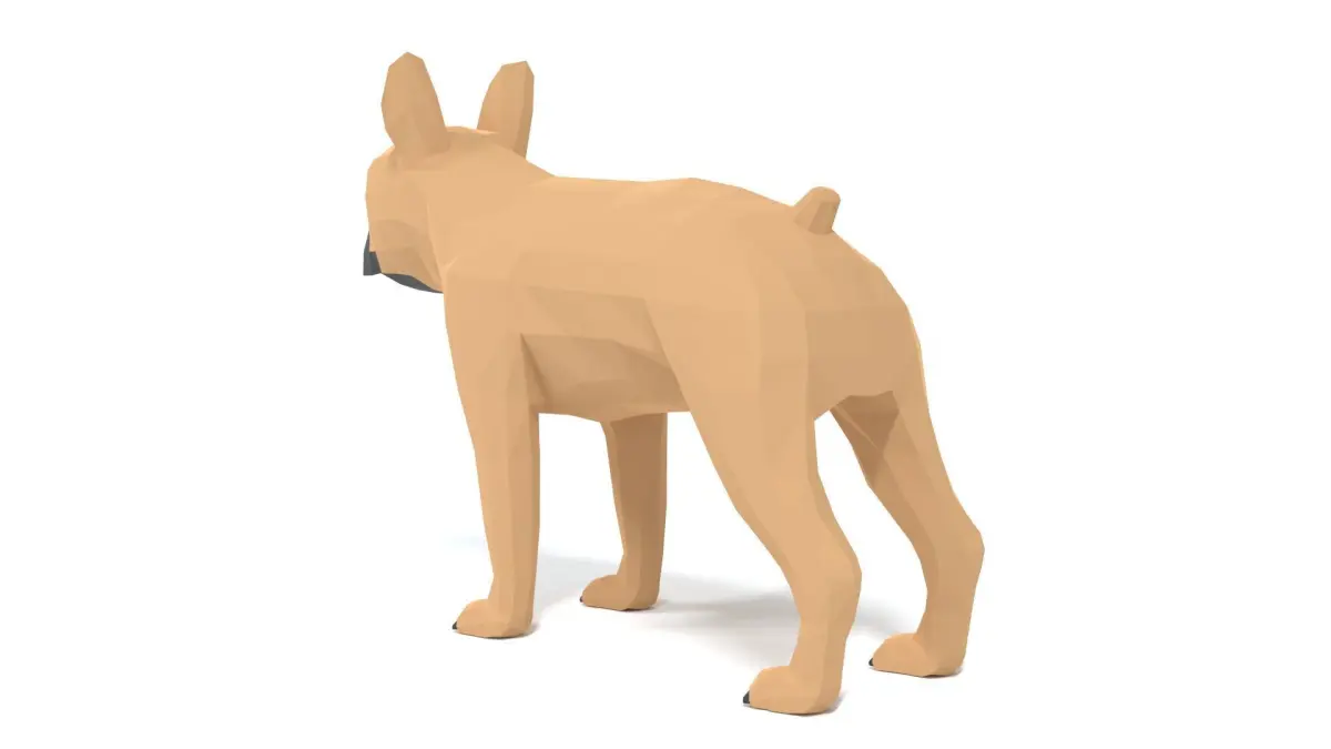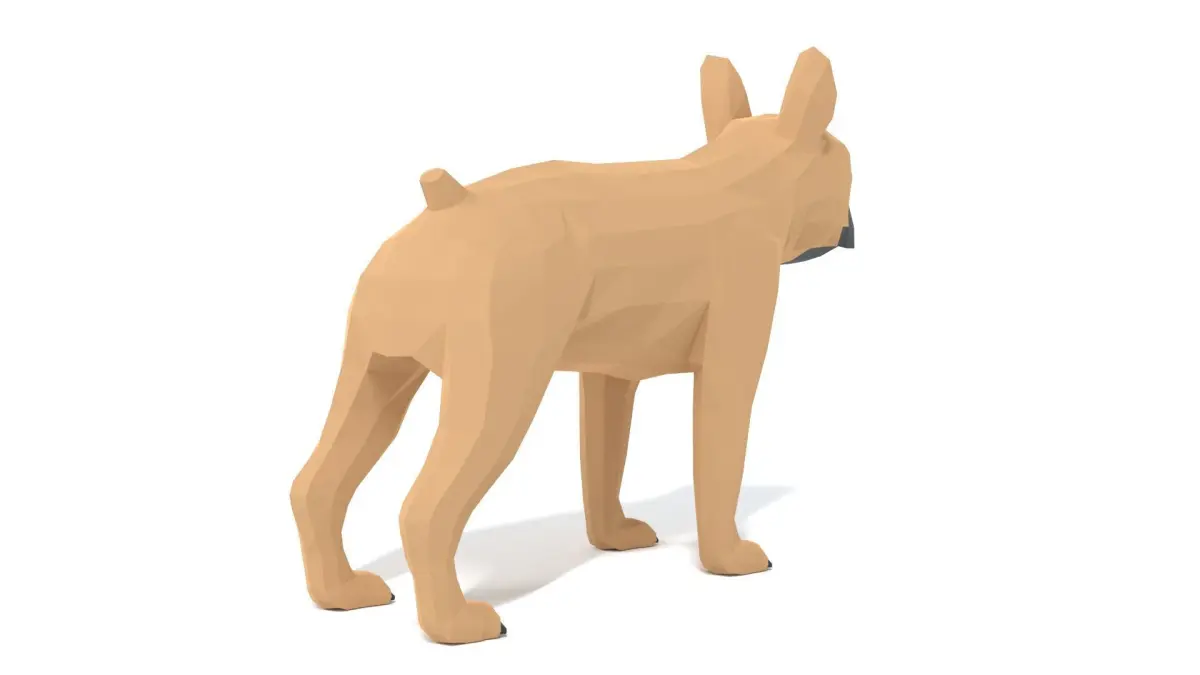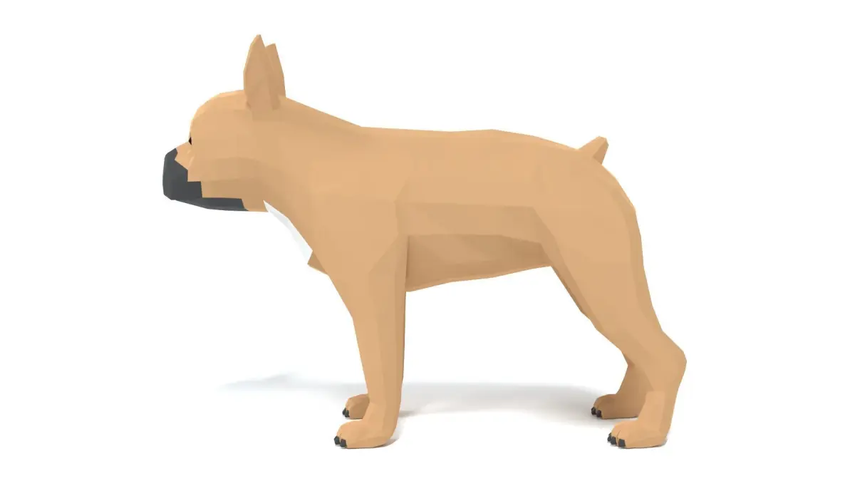 This is a low poly 3D model of a French Bulldog. The low poly dog was modeled and prepared for low-poly style renderings, background, general CG visualization presented as 1 mesh with quads/tris.