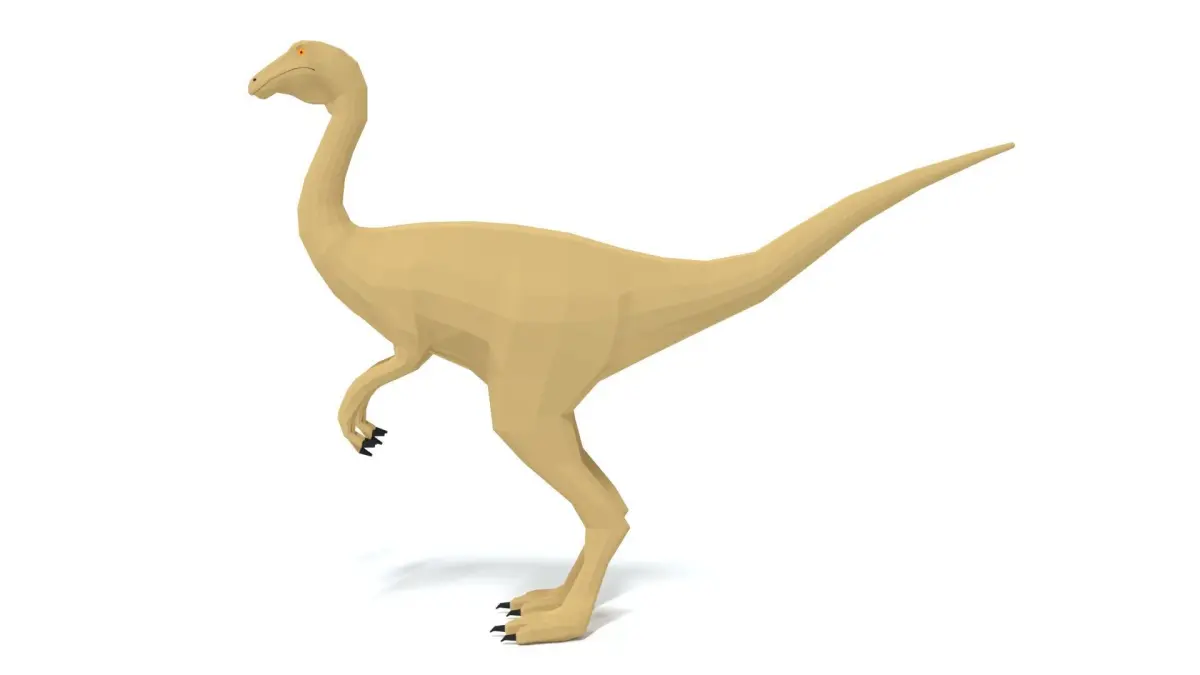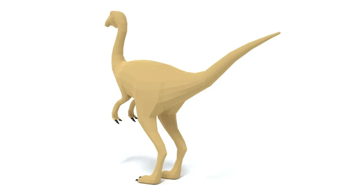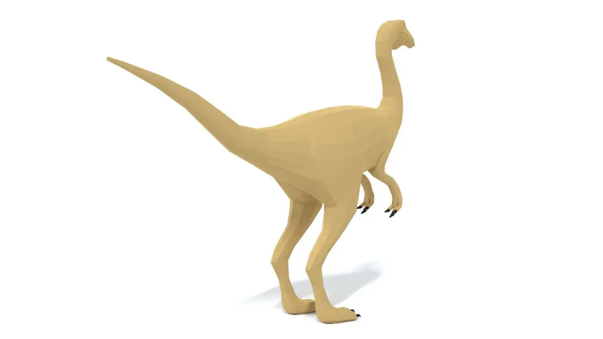 This is a low poly 3D model of a Gallimimus Dinosaur. The low poly dinosaur was modeled and prepared for low-poly style renderings, background, general CG visualization presented as 1 mesh with quads only.