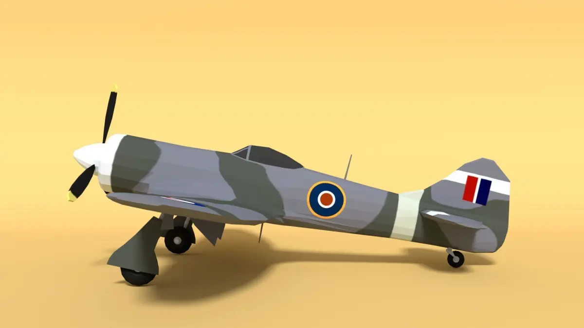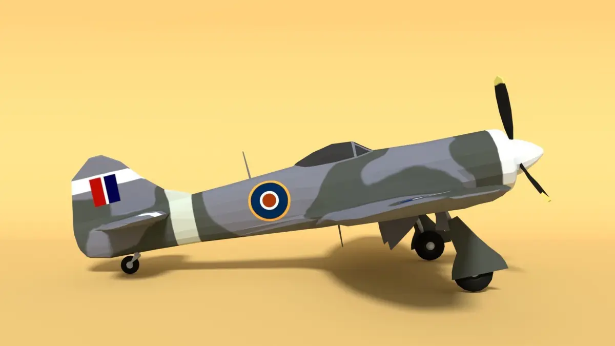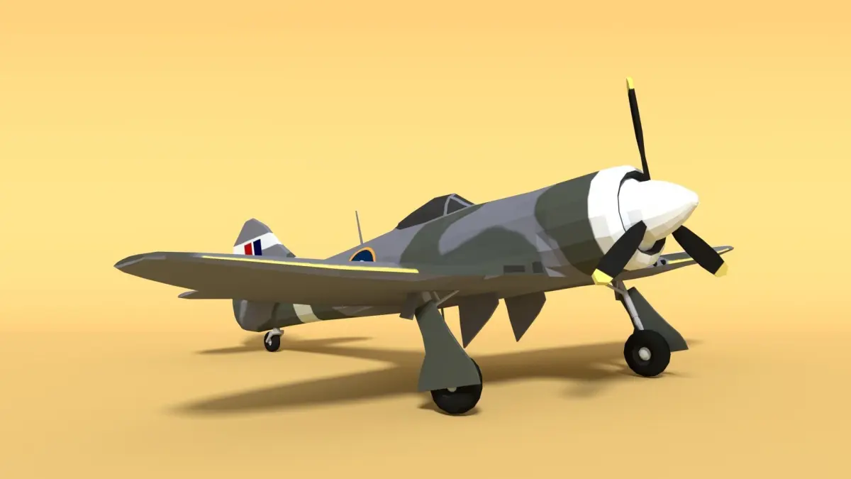 This is a low poly 3d model of a Hawker Tempest MK II Airplane. The low poly airplane was modeled and prepared for low-poly style renderings, background, general CG visualization.