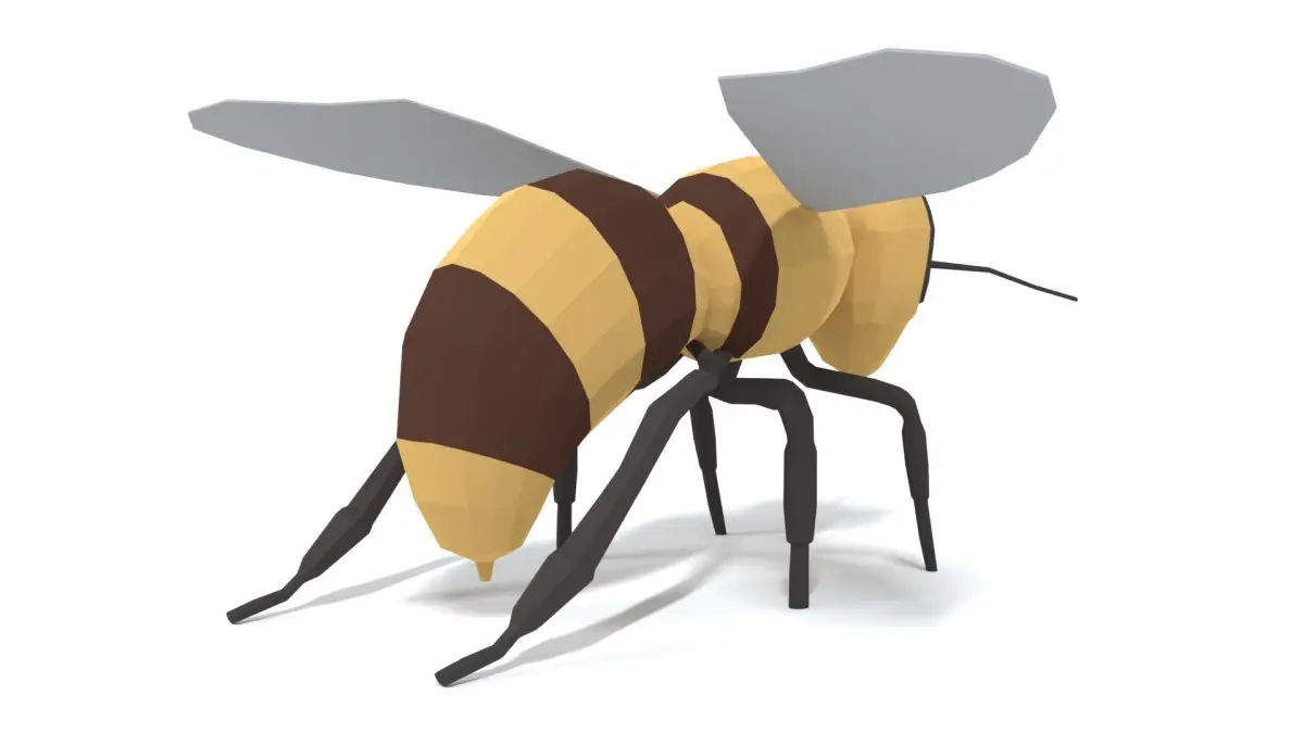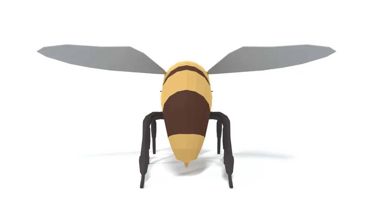 This is a low poly 3D model of a honye Bee. The low poly bee was modeled and prepared for low-poly style renderings, background, general CG visualization presented as 1 mesh with quads only.