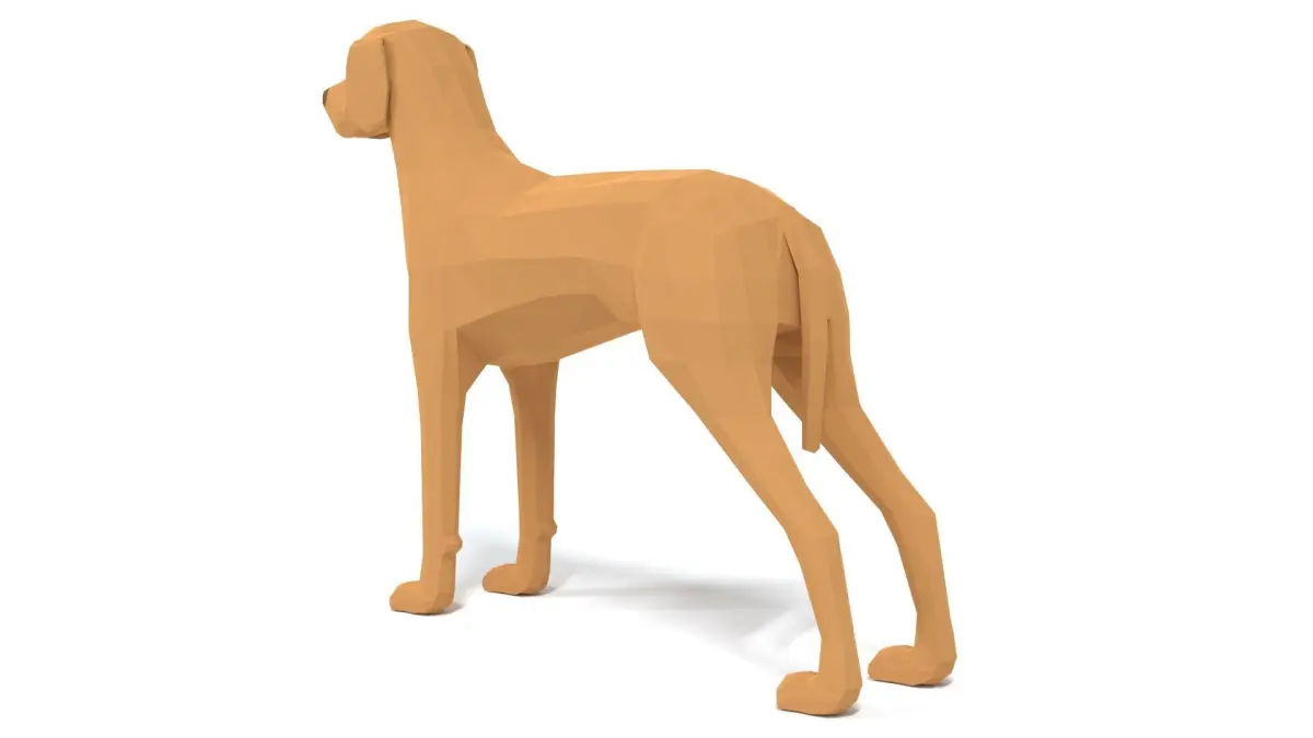 This is a low poly 3D model of a Hungarian Vizsla Dog. The low poly dog was modeled and prepared for low-poly style renderings, background, general CG visualization presented as 1 mesh with quads/tris.