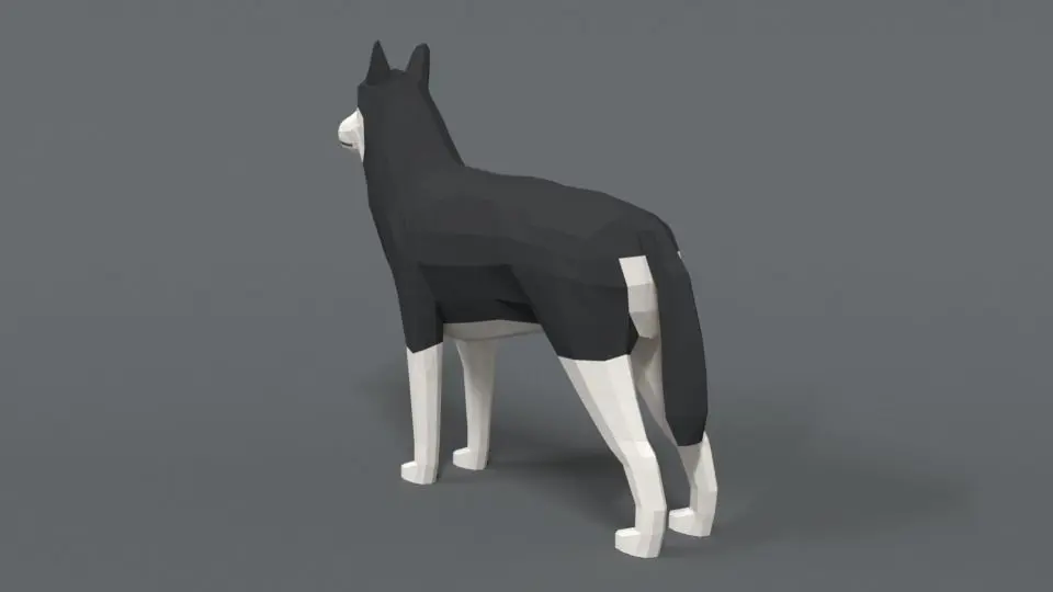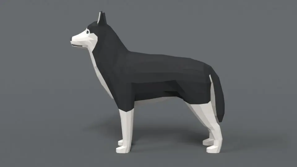 This is a low poly 3D model of a Husky. The low poly dog was modeled and prepared for low-poly style renderings, background, general CG visualization presented as a mesh with quads only.