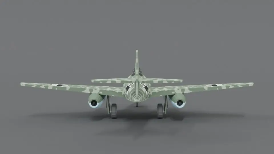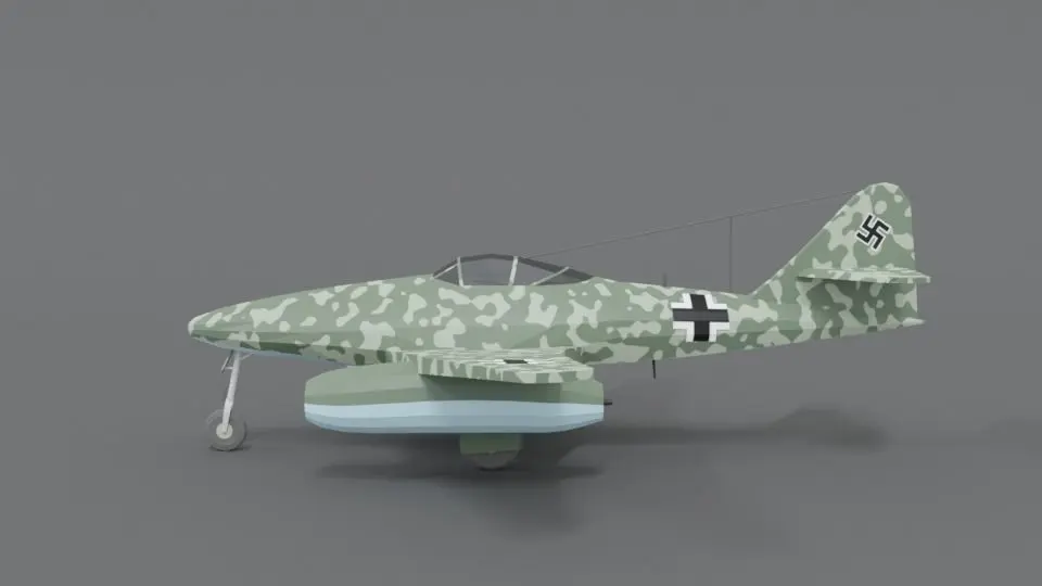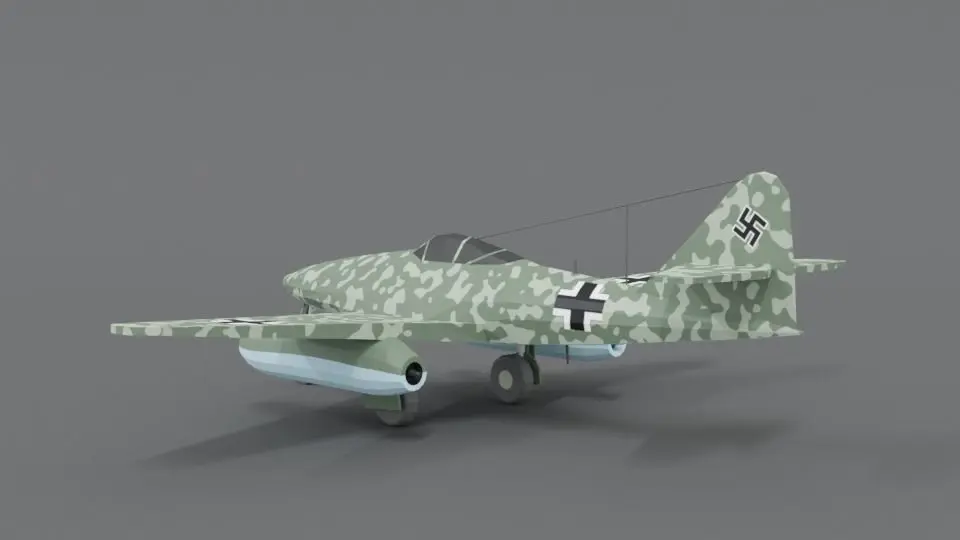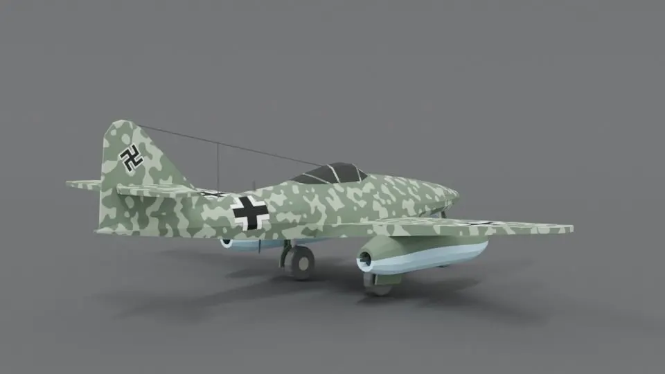 This is a low poly 3d model of a Messerschmitt Me 262 WWII German Airplane. The low poly airplane was modeled and prepared for low-poly style renderings, background, general CG visualization presented as 1 mesh with quads and some tris.