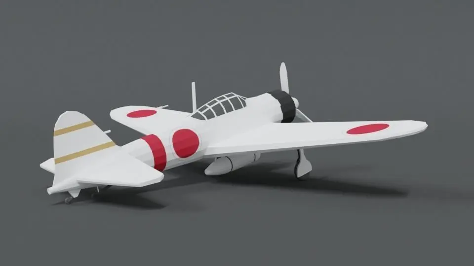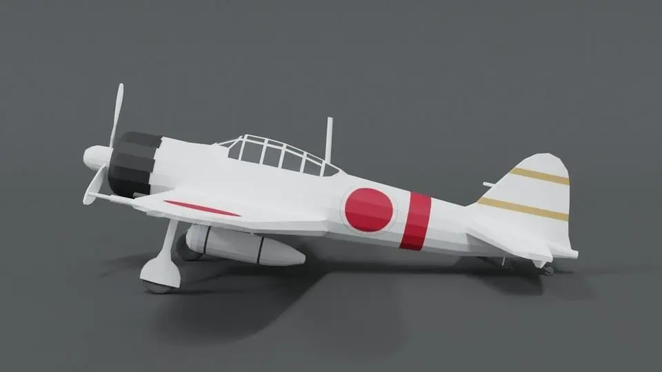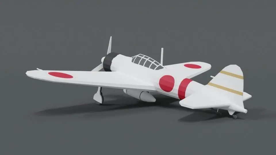 This is a low poly 3d model of a Mitsubishi A6M Zero WWII Japanese Airplane. The low poly airplane was modeled and prepared for low-poly style renderings, background, general CG visualization presented as 1 mesh with quads and some tris.