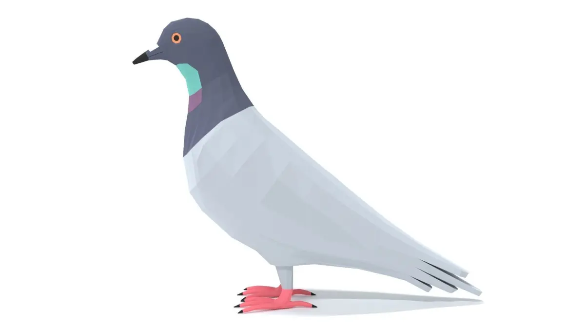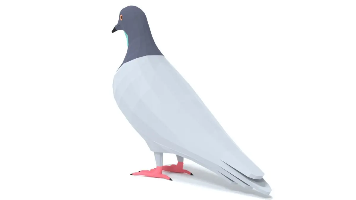 This is a low poly 3D model of a pigeon. The low poly pigeon was modeled and prepared for low-poly style renderings, background, general CG visualization presented as one mesh with quads only.