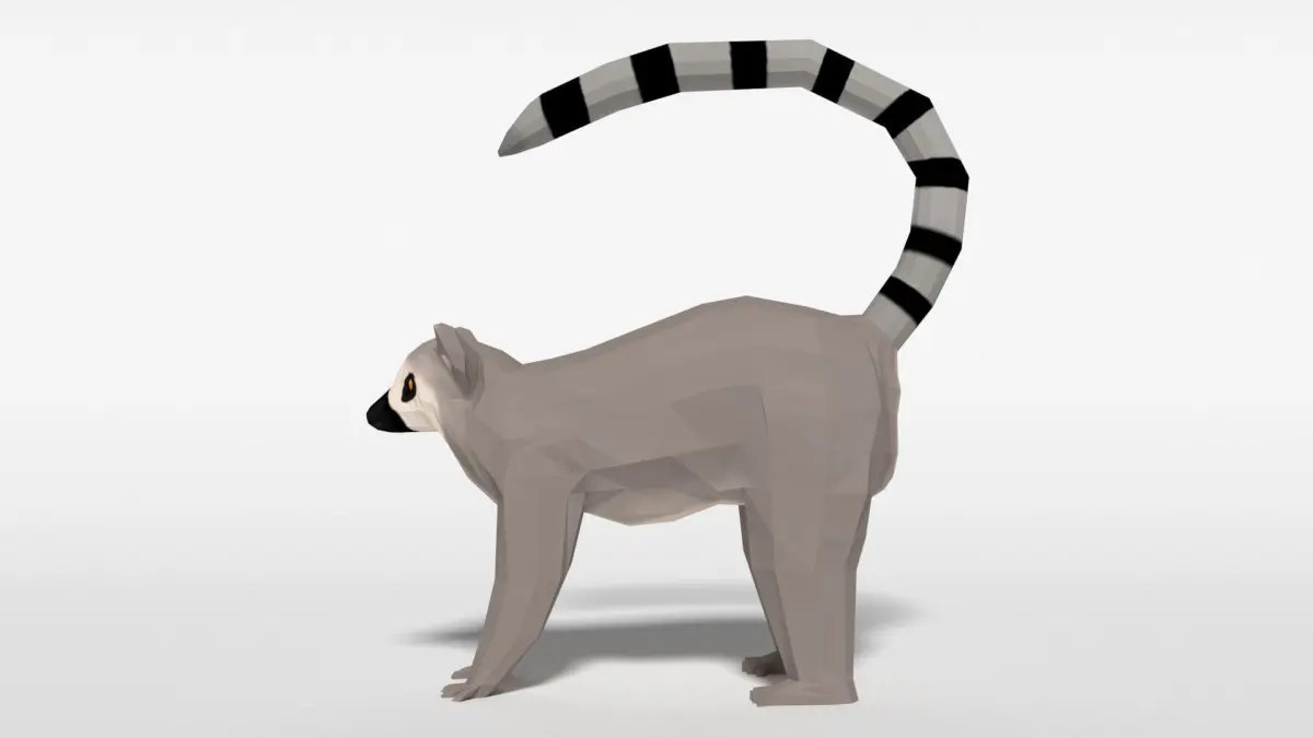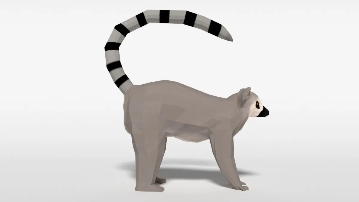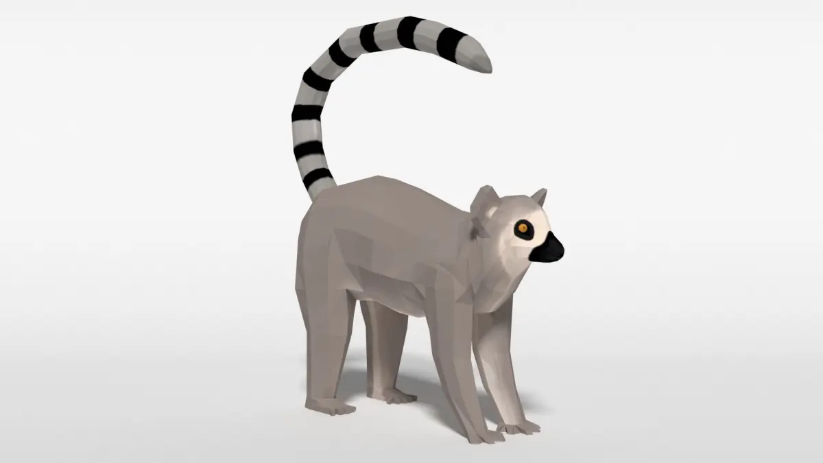 This is a low poly 3d model of a ring tailed lemur. The low poly lemur was modeled and prepared for low-poly style renderings, background, general CG visualization presented as a mesh with quads only.