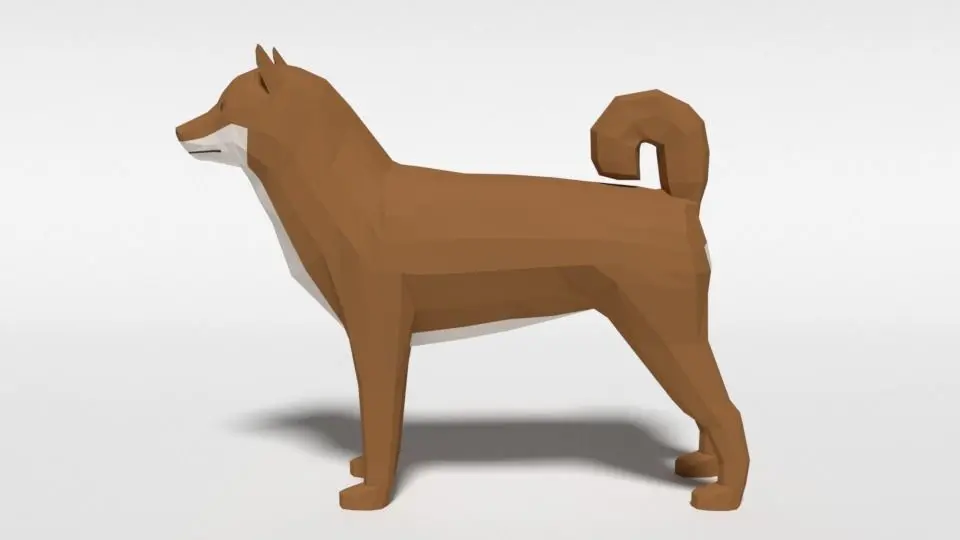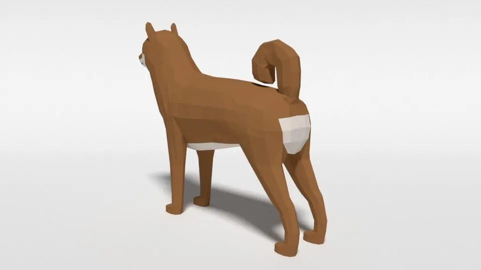 This is a low poly 3D model of a Shiba Inu dog. The low poly dog was modeled and prepared for low-poly style renderings, background, general CG visualization presented as a mesh with quads only.